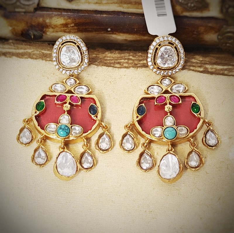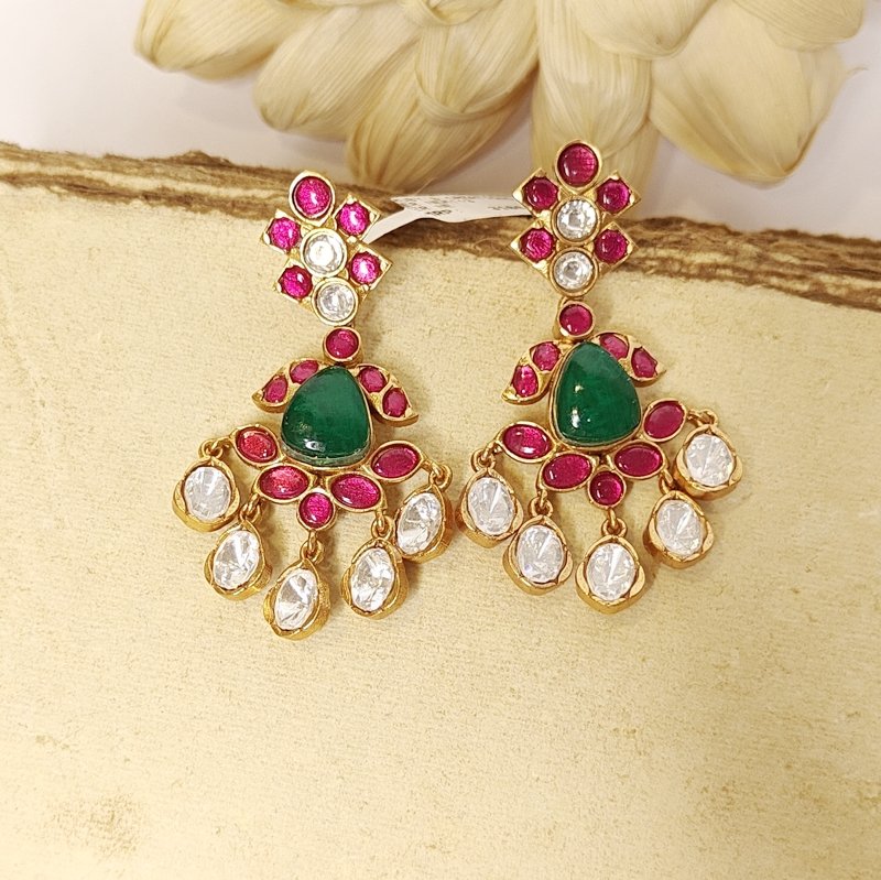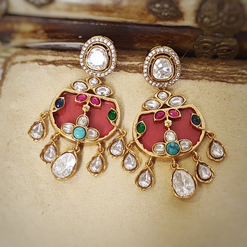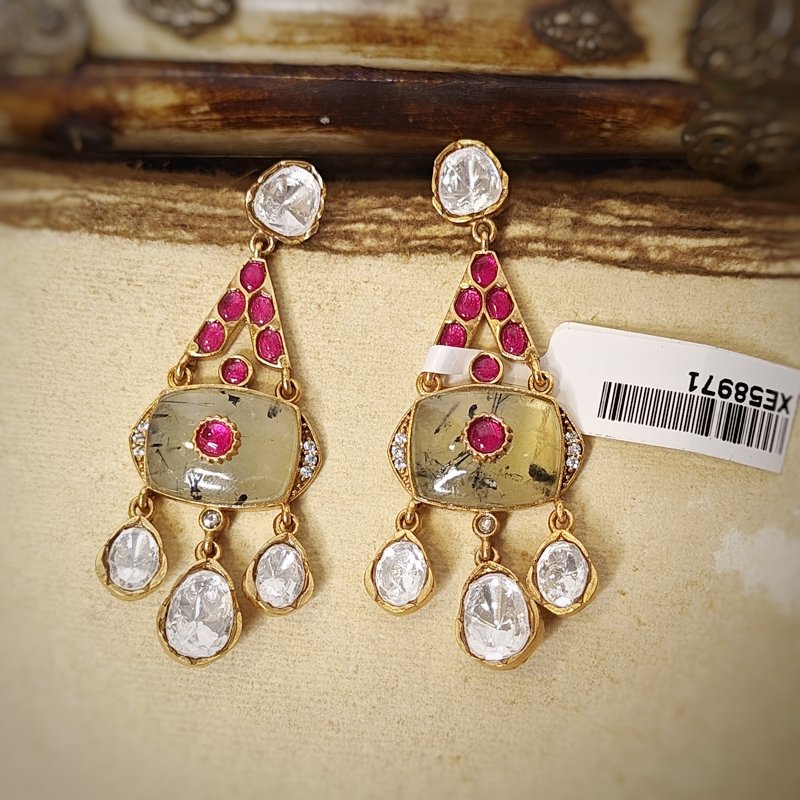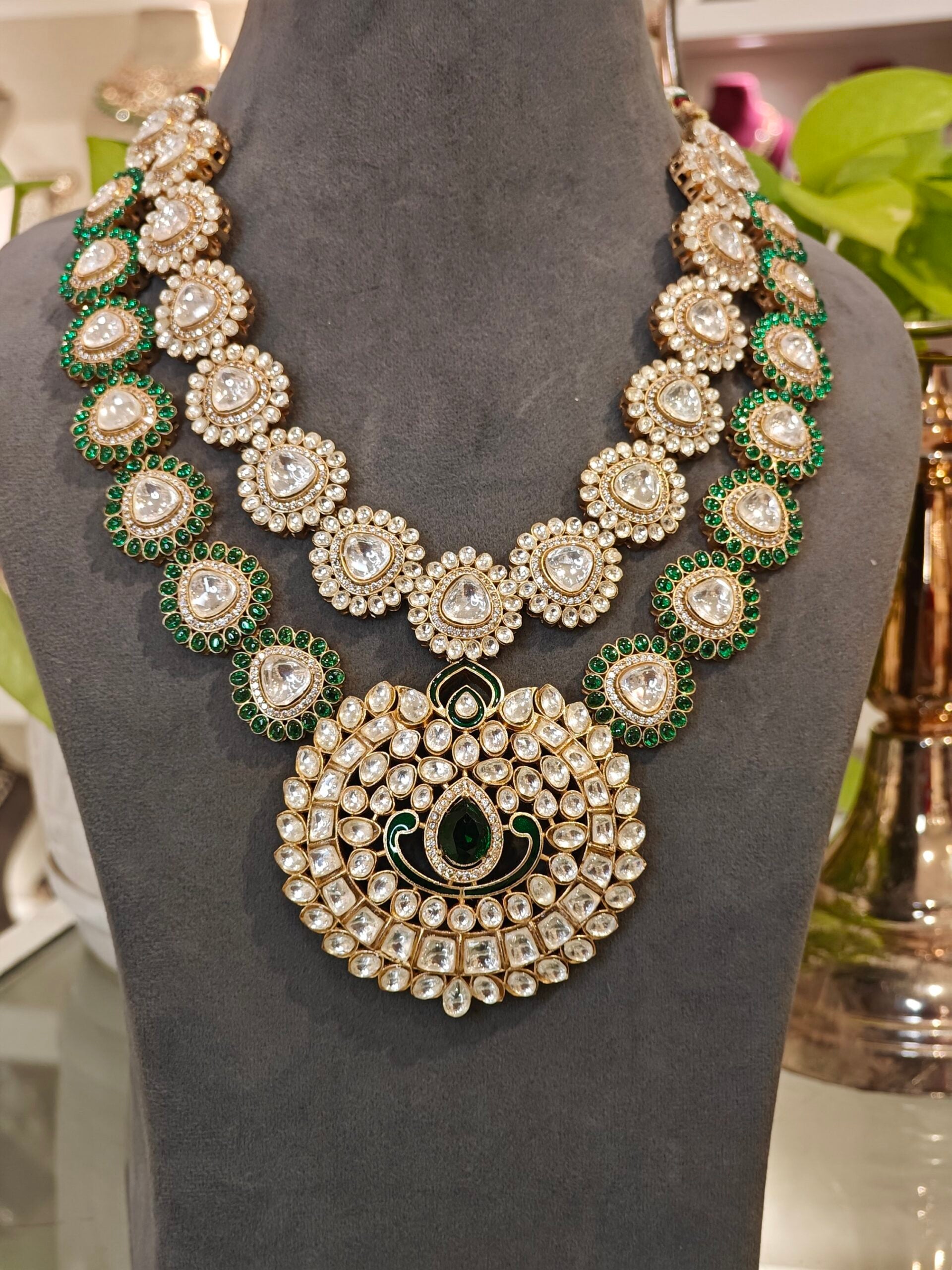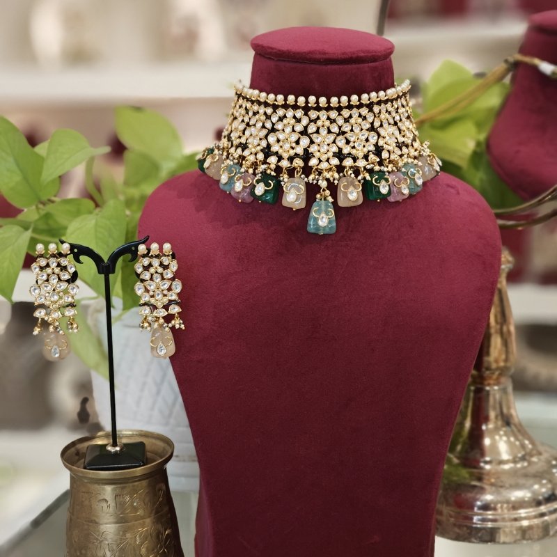 The Aaarti choker set ,plated in 22 kt gold is embellished with the finest paachi kundan and beautifully adorned with big Studs ,beaded with clear transparent quartz and mint green oval beads with pearls .