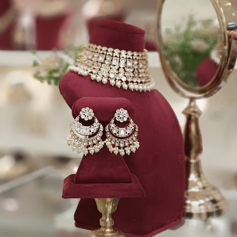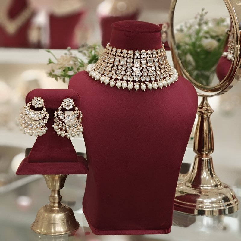 A jewelry set designed for brides consisting of an uncut polki choker and large chaandbali earrings. Both pieces are studded with CZ stones and plated in 22 kt gold. The choker is also adorned with beads made of pearls and golden balls.