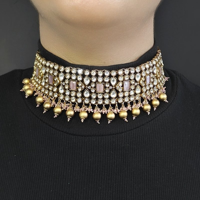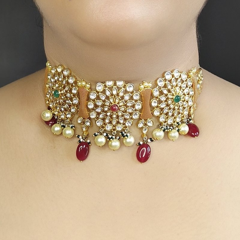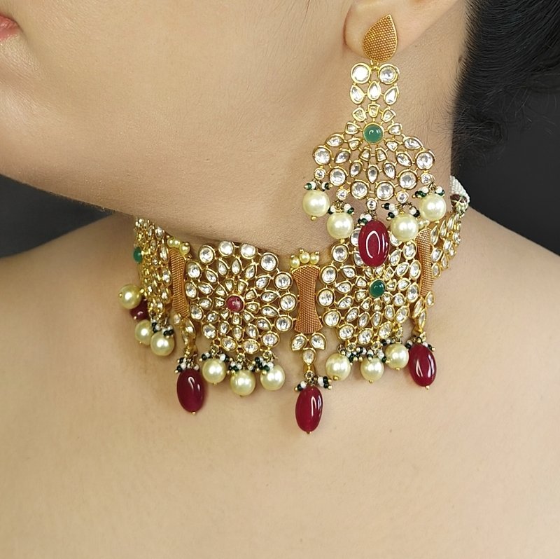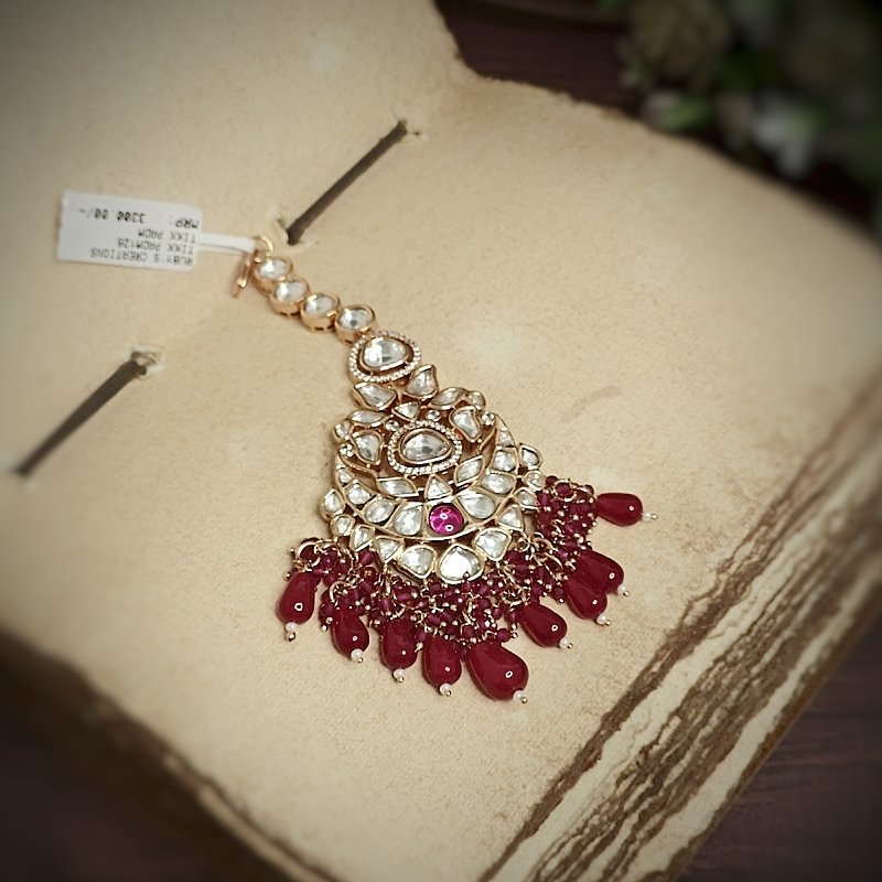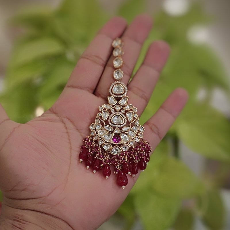 Crafted with the finest 18-karat gold plating, this maangtikka is adorned with stunning uncut artificial polki and ruby coloured beads . Revel in the beautiful craftsmanship of this piece, which is sure to make you feel like royalty.
