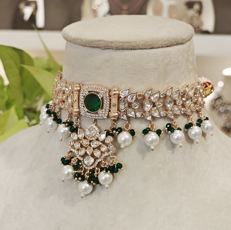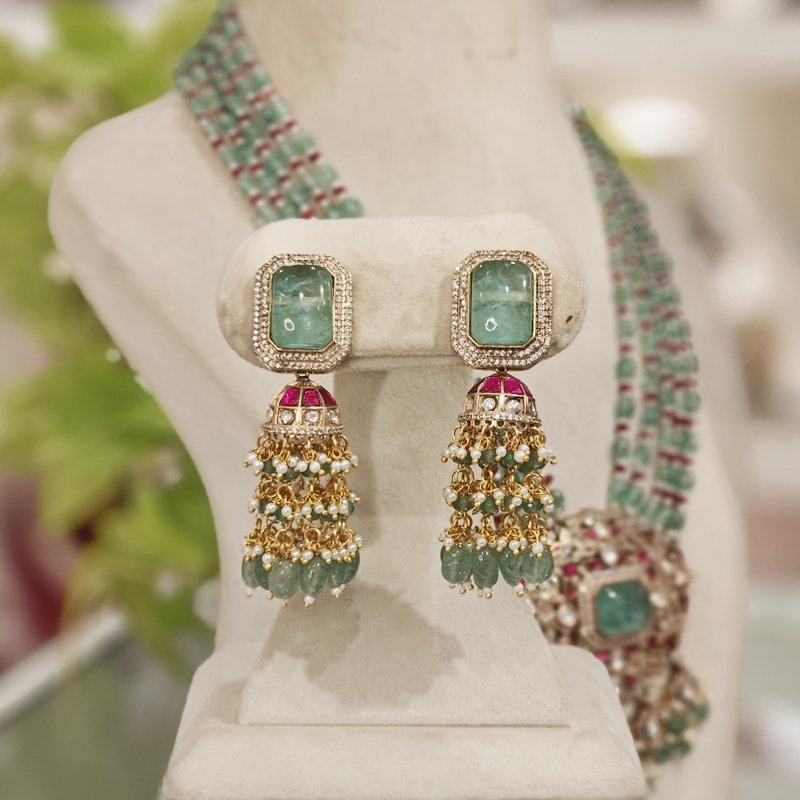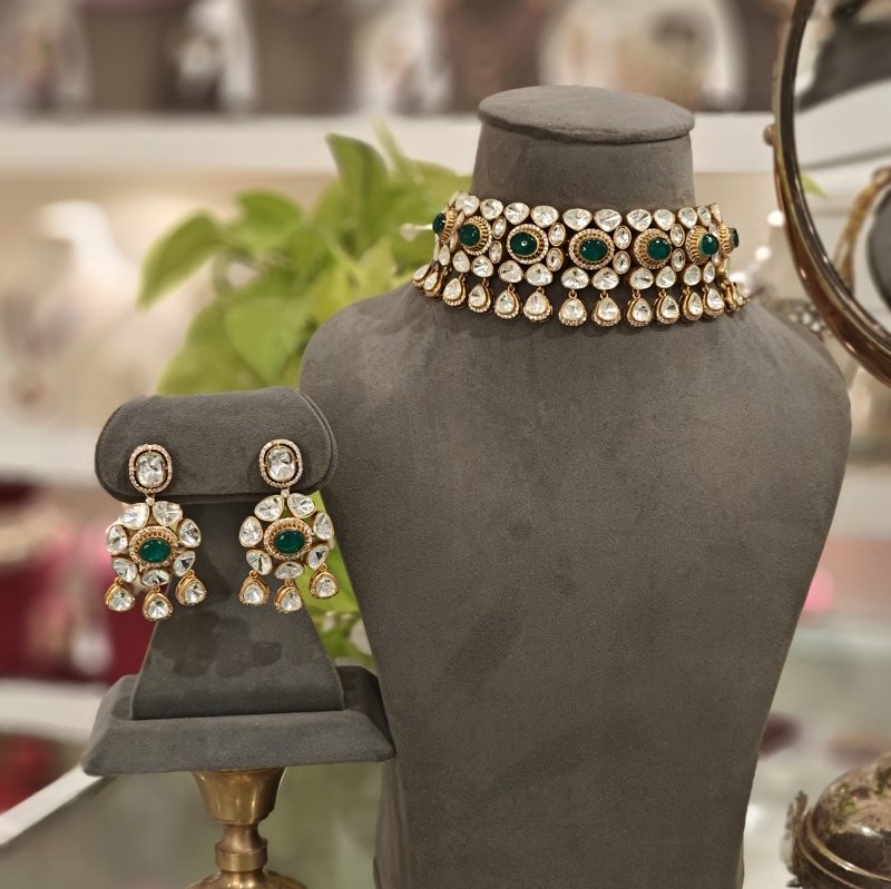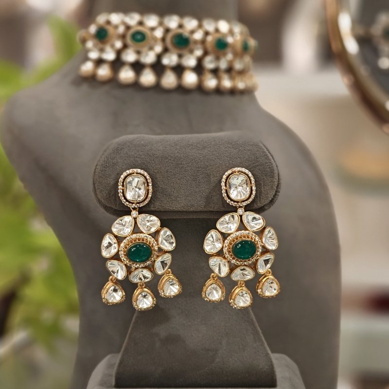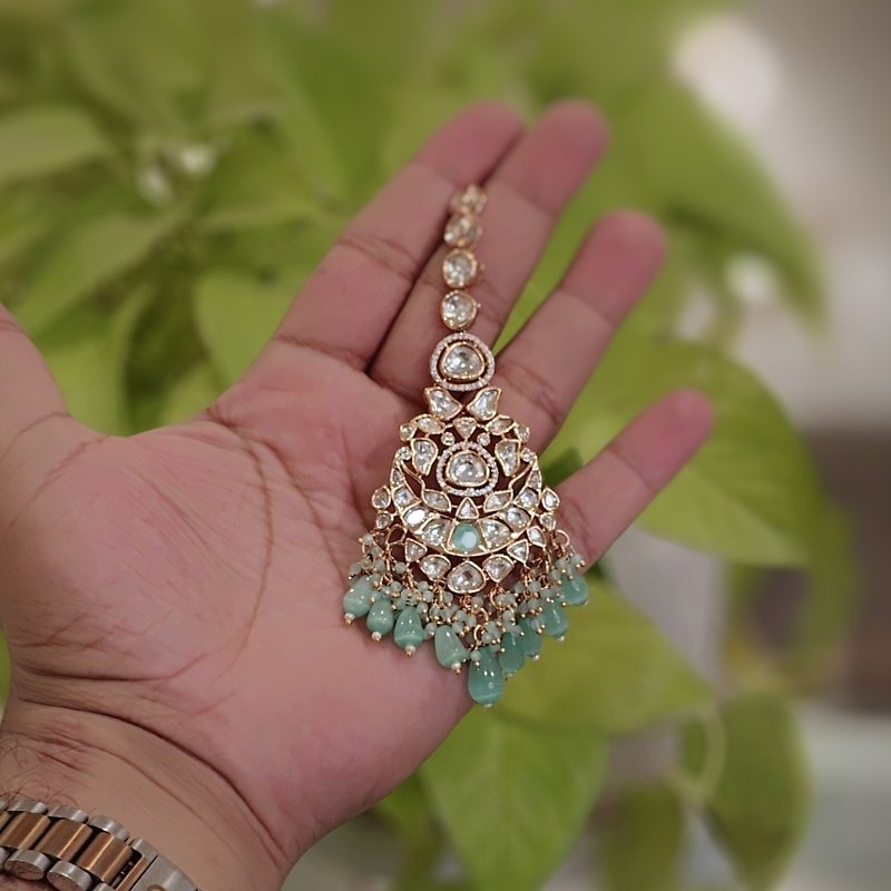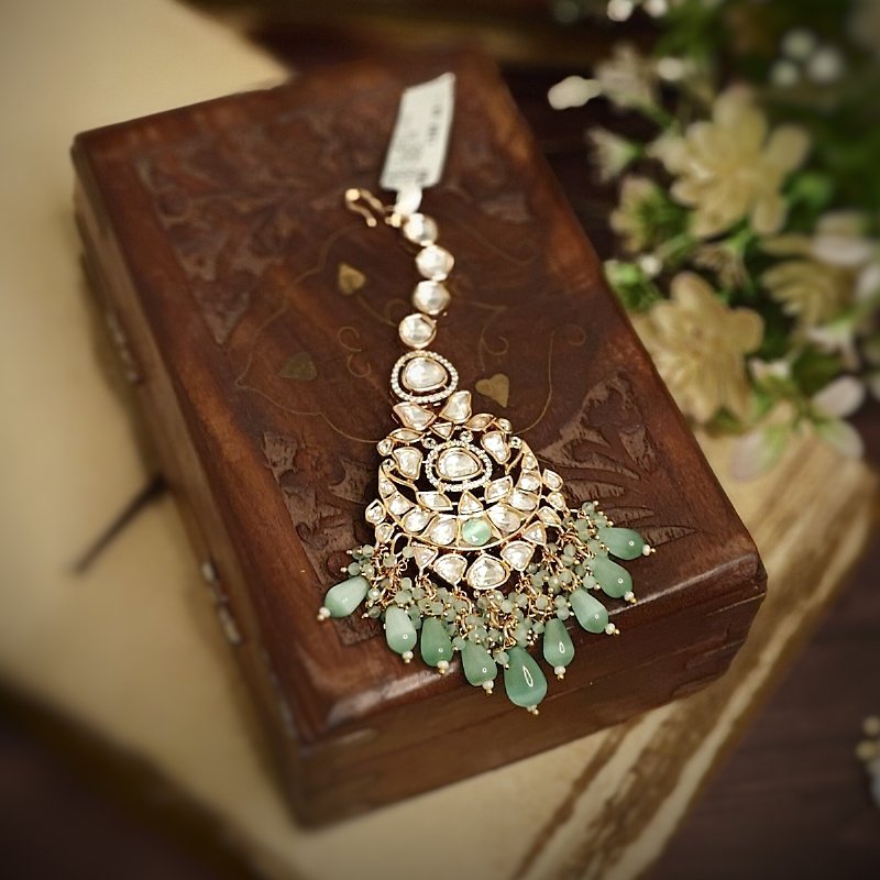 Crafted with the finest 18-karat gold plating, this maangtikka is adorned with stunning uncut artificial polki and monalisa mint green drop beads . Revel in the beautiful craftsmanship of this piece, which is sure to make you feel like royalty.