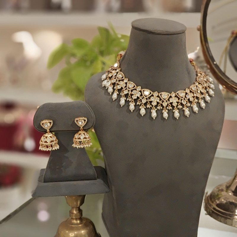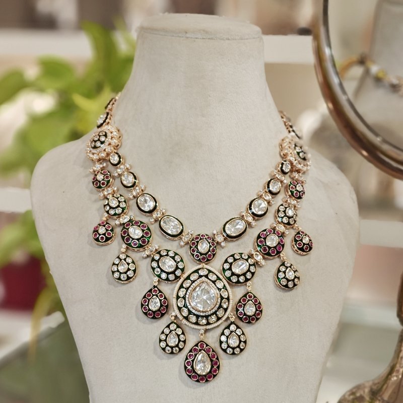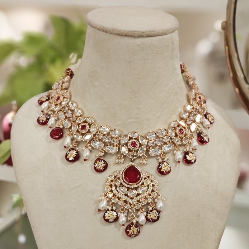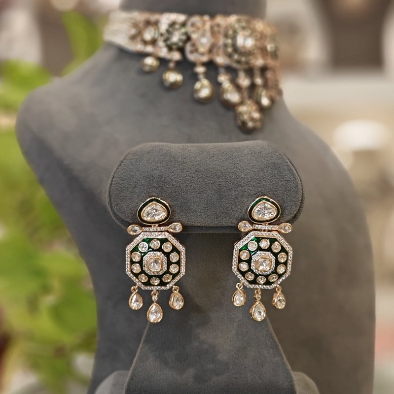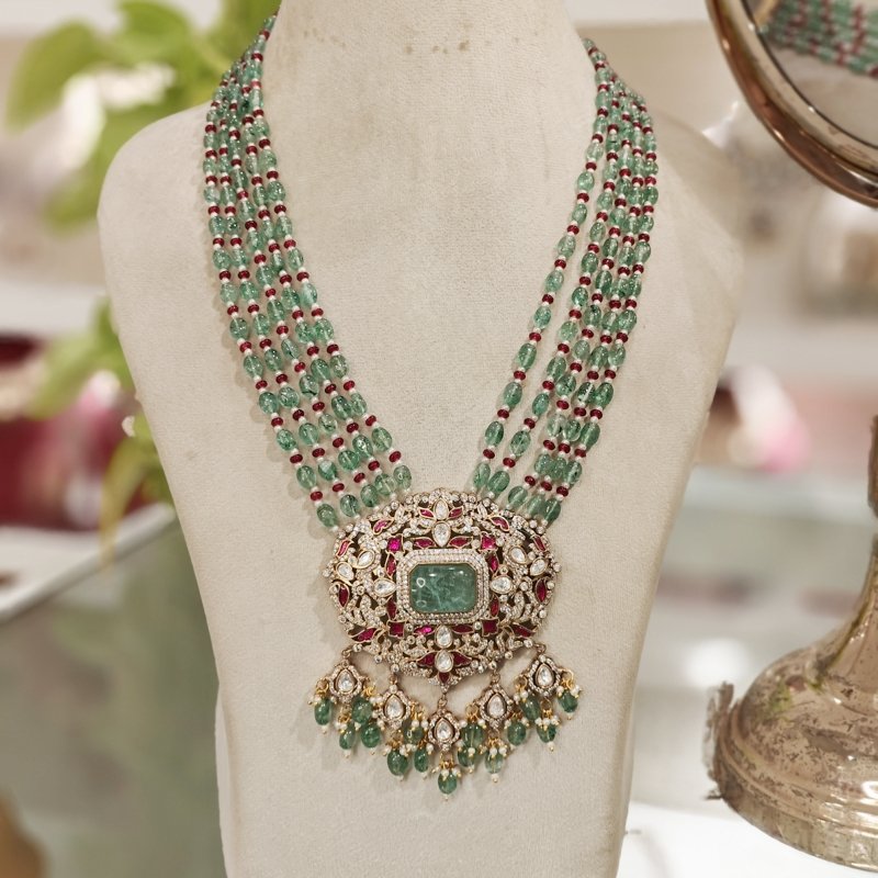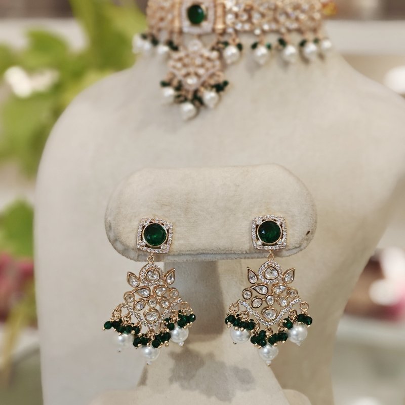 Crafted with the finest 18-karat gold plating, this maangtikka is adorned with stunning uncut artificial polki and monalisa mint green drop beads . Revel in the beautiful craftsmanship of this piece, which is sure to make you feel like royalty.