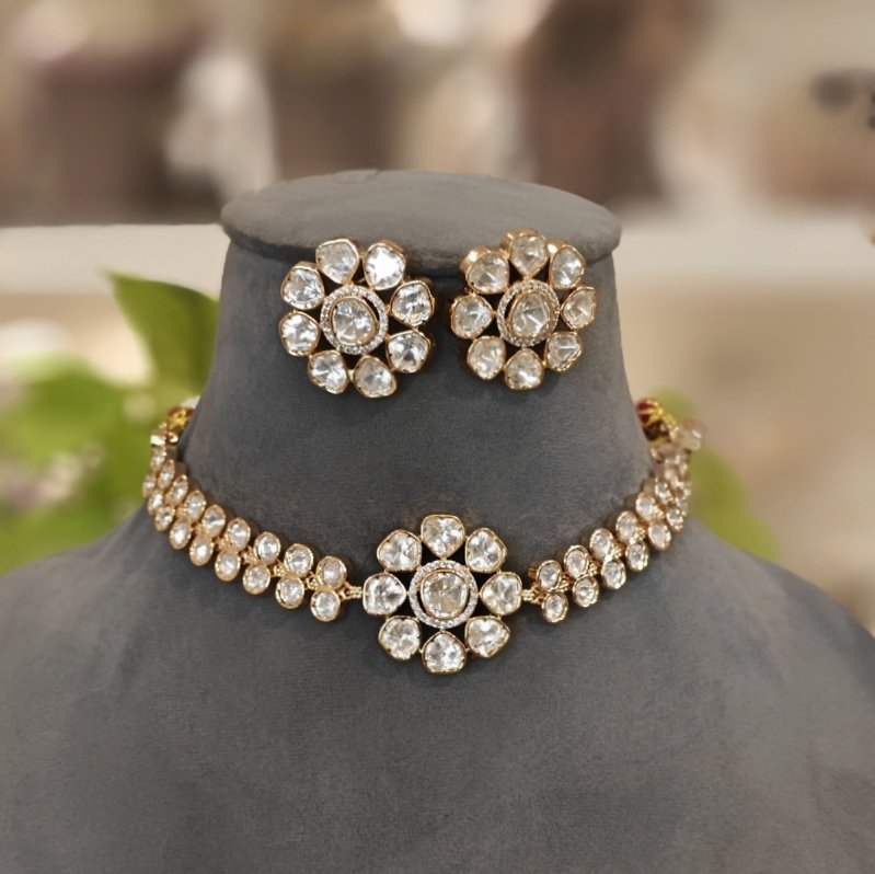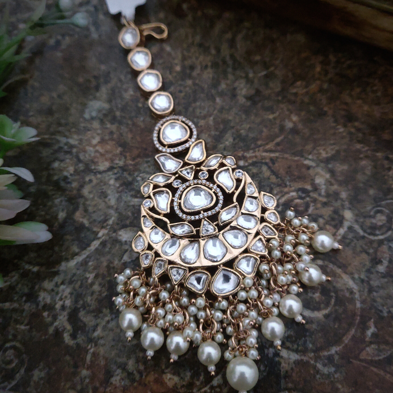 Aadal MaangTikka is made in Uncut artificial Polki and Beaded with white Pearls .This Tikka can be Customised in Any colour of your Choice .
