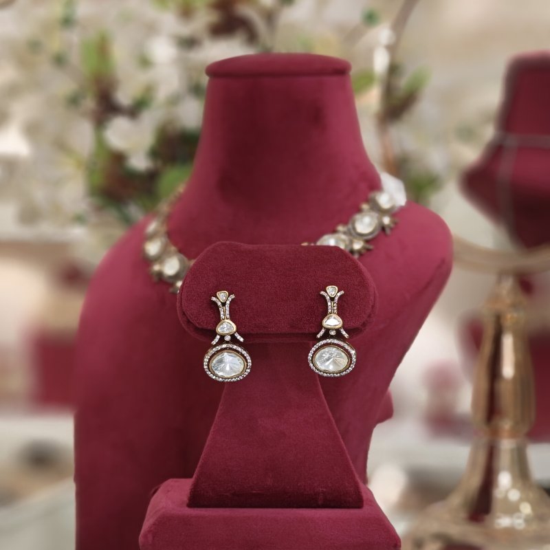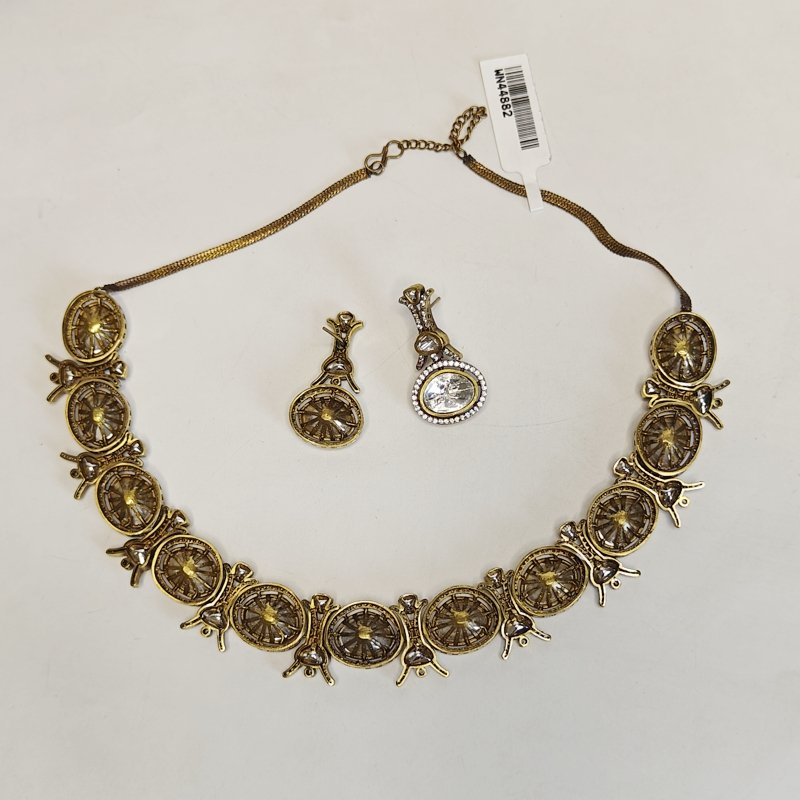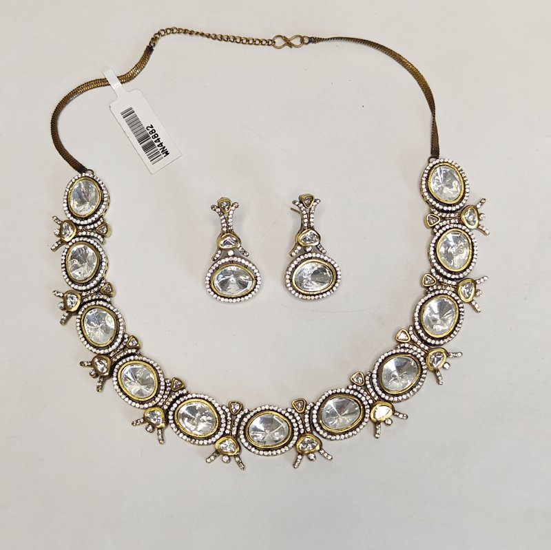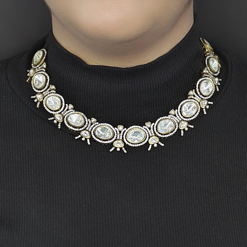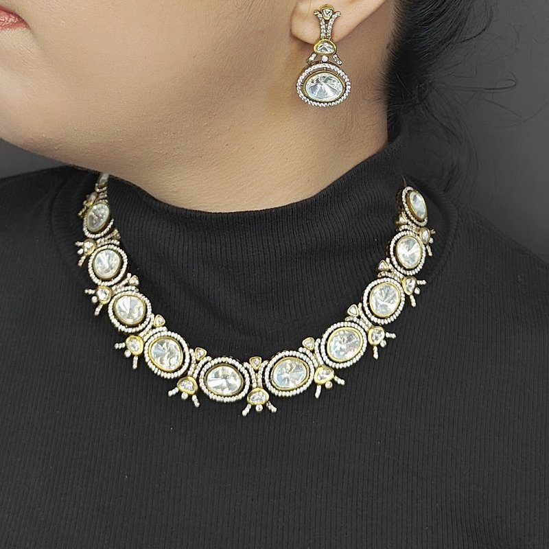 A necklace set designed with Polki gems that are larger in size, surrounded by small CZ stones arranged in a micro pave setting and plated in antique mehandi polish .