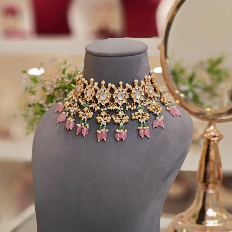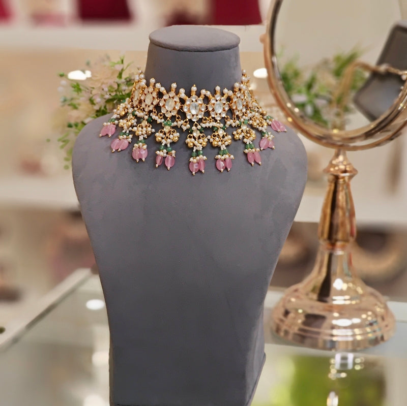 The Aadhyaa choker set ,plated in 22 kt gold is embellished with the finest paachi kundan and beautifully adorned with big jhumkas ,beaded with pink monalisa beads along with pearls and mint green rounds .