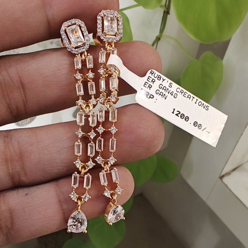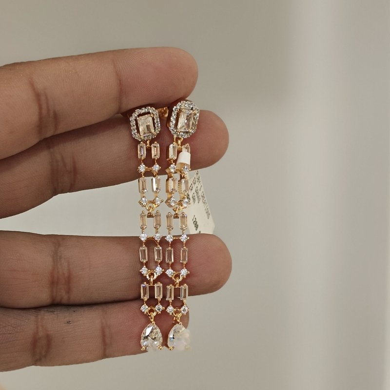 These super flexible danglers are made with emerald cut cz stones and plated in 22 kt gold polish with cz tear drop hanging at the bottom .