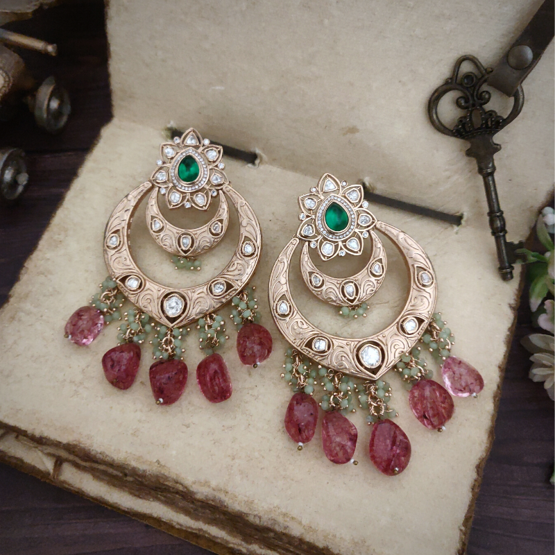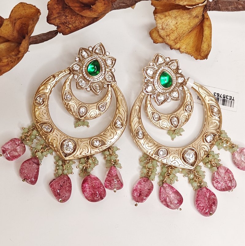 Aahana Chaandbalies are made in embossing workmanship with Uncut Artificial polki stones teamed up with cz and green Pota stone .These earrings are beaded with mint green hydro beads and hot pink tourmaline bead.