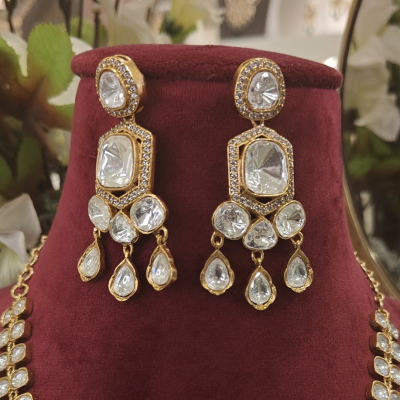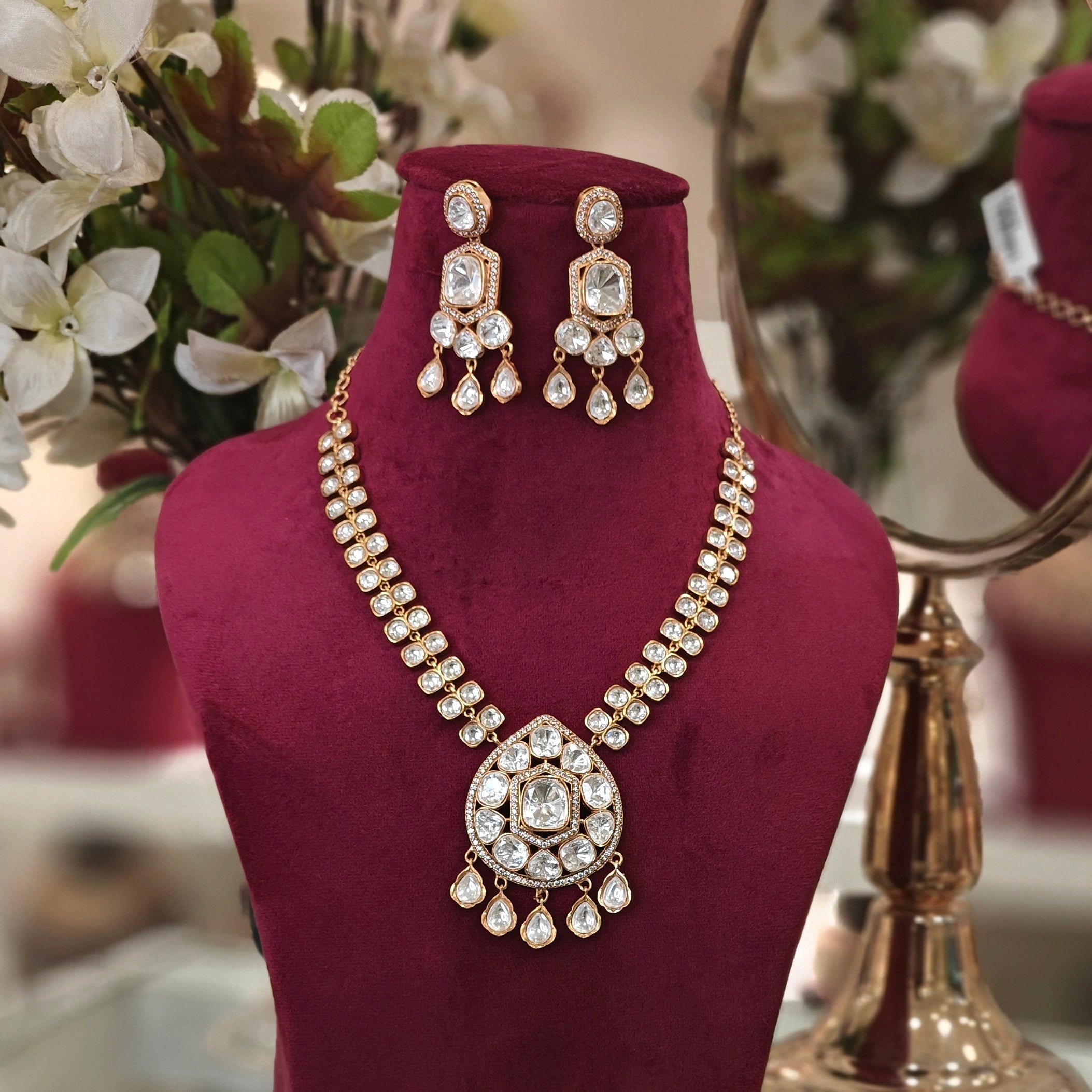 The Aahita pendent set is meticulously crafted using the finest uncut lab grown polkis, which is then plated with a luxurious 22 kt gold colour to add more charm to it. To create this ornate piece of beauty even more special, the necklace is integrated with lovely small cz stones on the border .