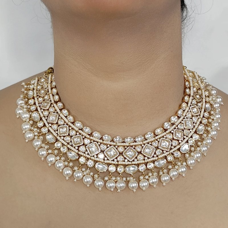 This exquisite bridal necklace set is a true masterpiece, studded with uncut CZ Polki stones and sparkling cubic zirconia. Beaded finely with pearls, it exudes timeless elegance and luxury, making it the perfect choice for brides seeking a blend of traditional charm and contemporary brilliance.