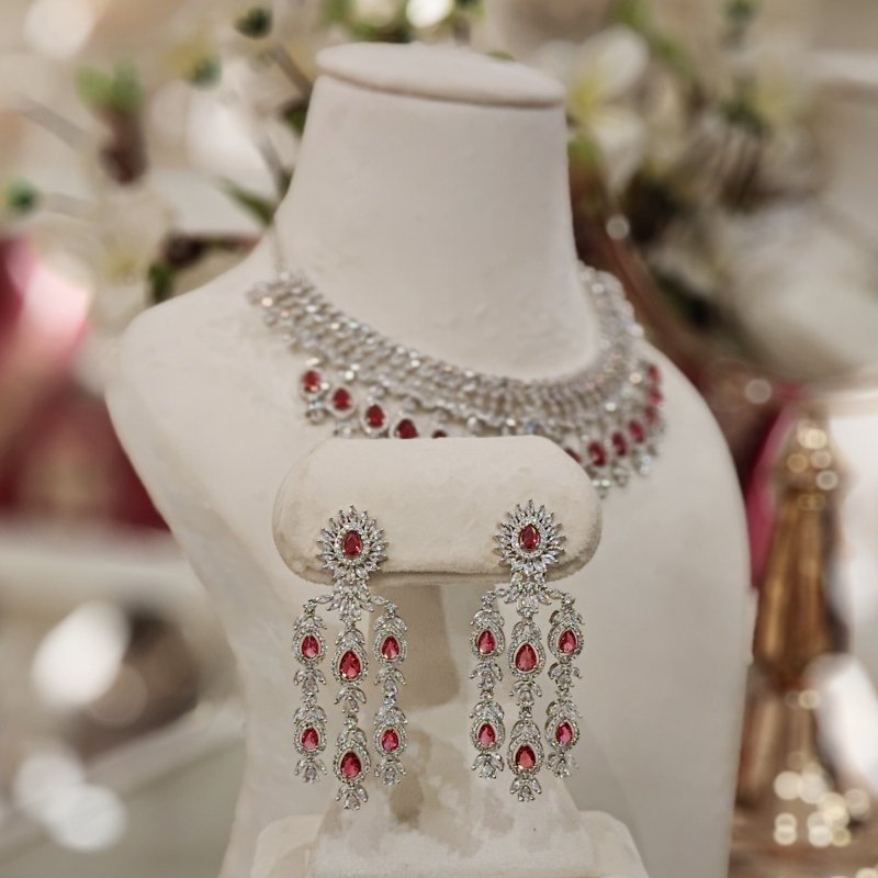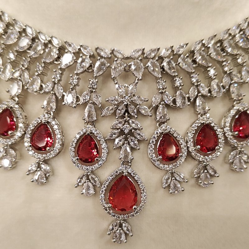 The exquisite neckpiece is created with Ruby red and clear CZ stones . It has been elegantly designed with a White rhodium plating.