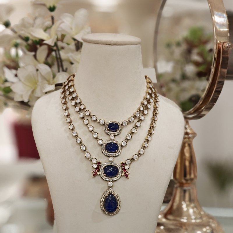 Aloka stunning necklace set made in three line design studded with moissanite ,cz and royal blue hydro stone,crafted in silver mixed metal alloy and plated in antique black gold plating