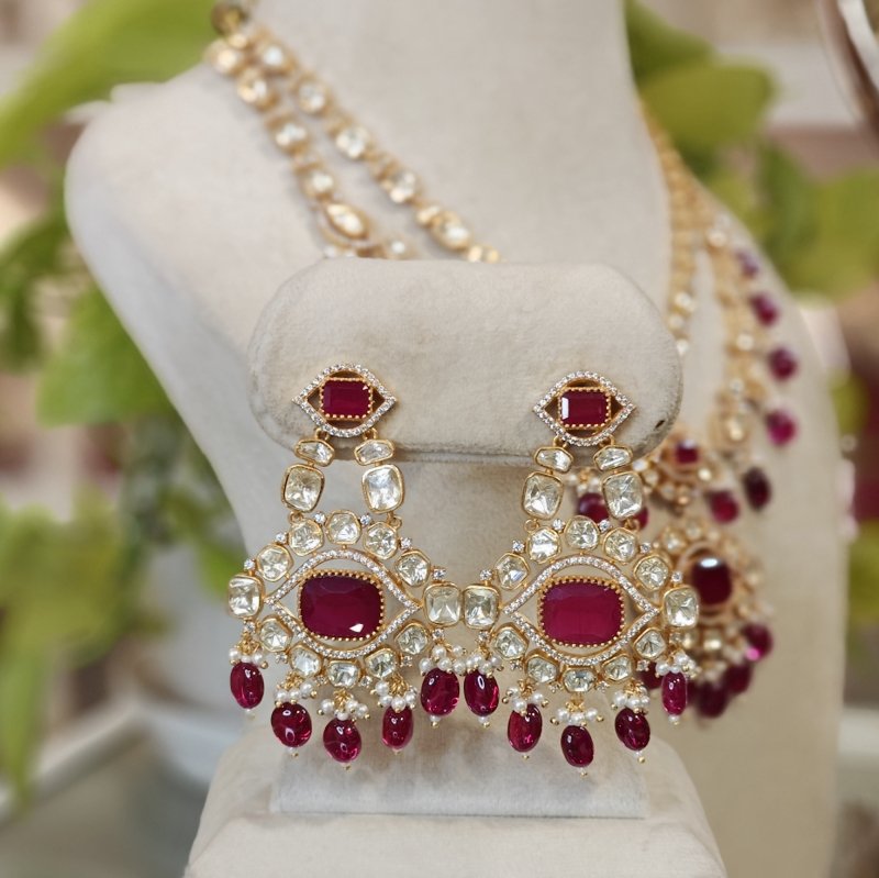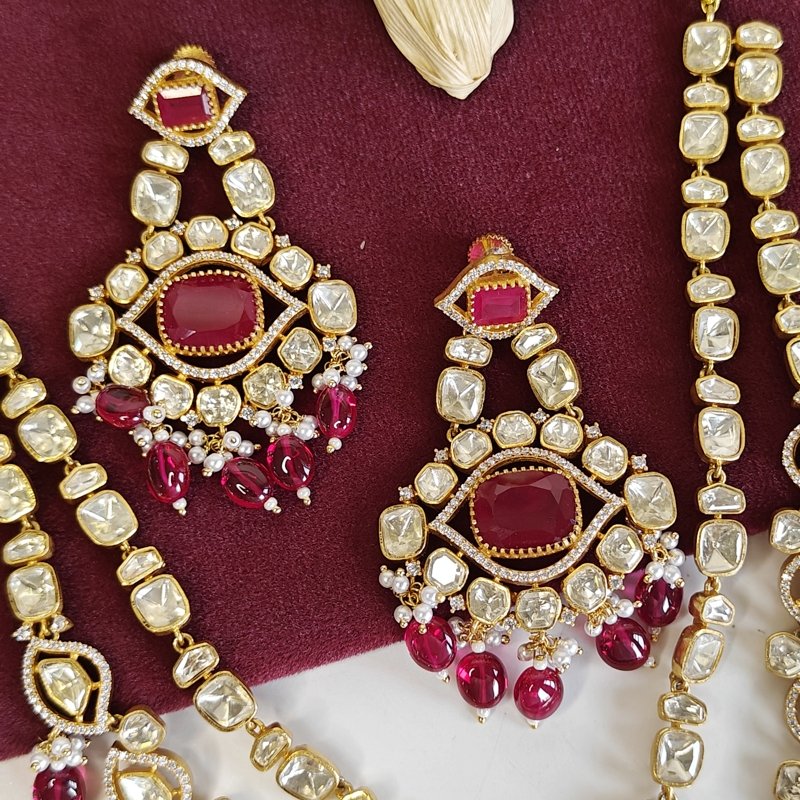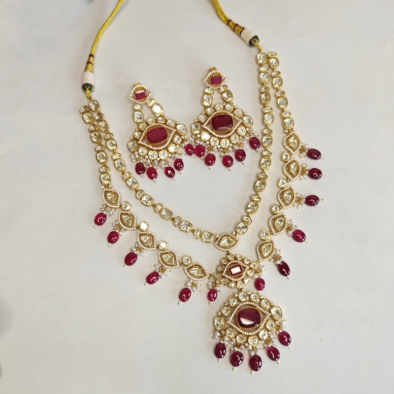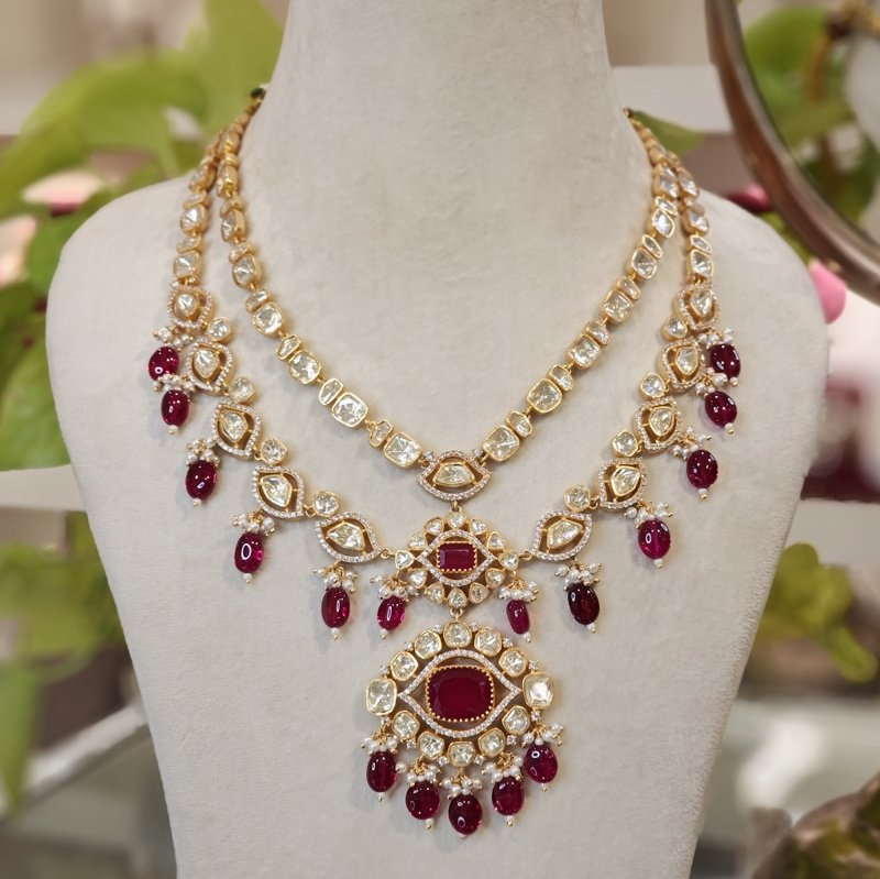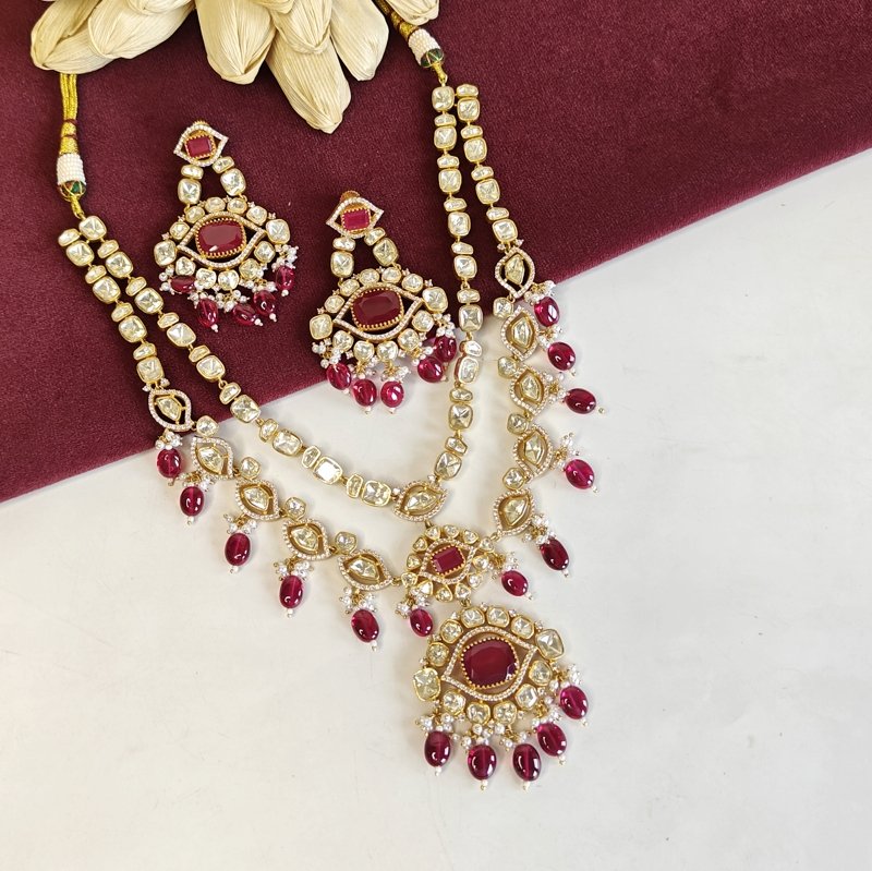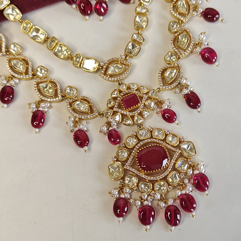 This stunning double line string along with pendent is a true masterpiece, featuring Moissanite polki and creative ruby gemstones. The design is complemented by intricate silver daak elements and plated with luxurious 22K gold, offering a captivating and elegant finish. Perfect for those seeking a blend of sophistication and timeless beauty.