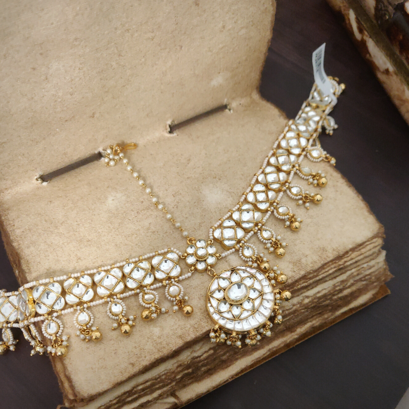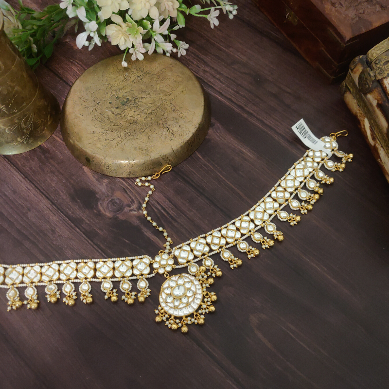 Crafted in pacchi kundan workmanship , this designer mathapatti features white kundan stones in moon design. It is embellished with white pearls and golden balls to add a touch of sophistication.