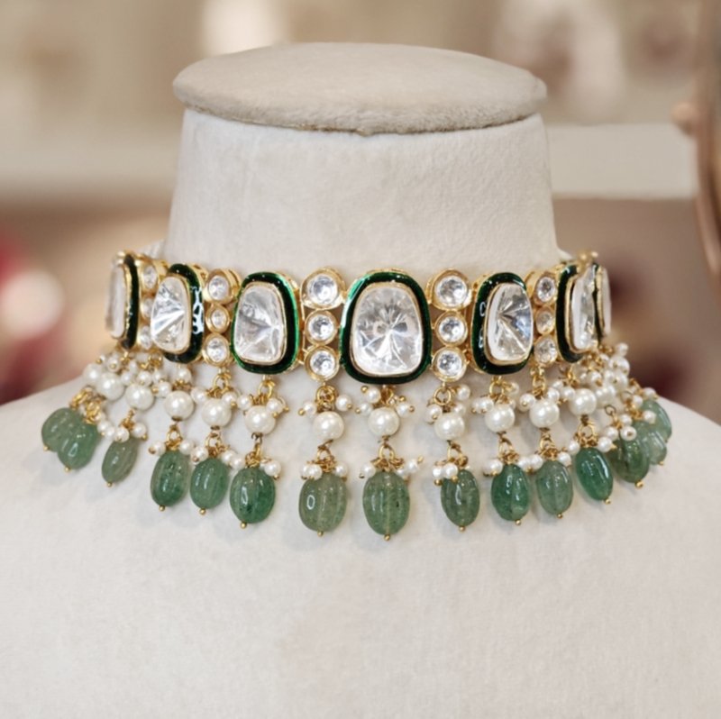A stunning choker necklace set adorned with Kundan Polki stones, elegantly beaded with pearls and emerald green strawberry stones. It is plated in 22kt gold and crafted from a silver mixed metal alloy, offering a perfect blend of traditional artistry and contemporary charm.