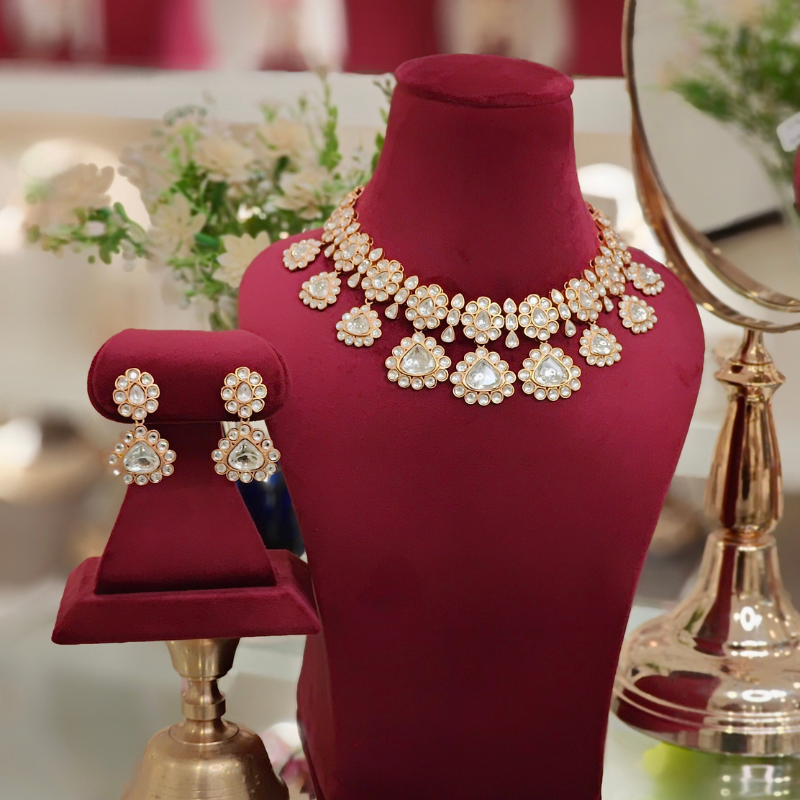 This necklace set, adorned with artificial polki, has been coated with 22 kt gold polish. It comes with matching earrings.