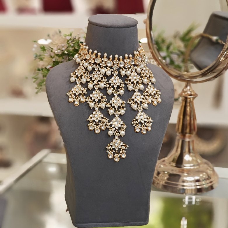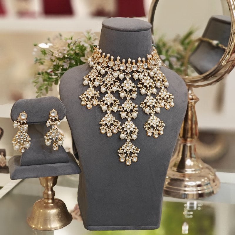The Aaarani Bridal choker set ,plated in 22 kt gold is embellished with the finest paachi kundan and beautifully adorned with mid sized earrings ,beaded with white pearls . this set can be customised in any colour of your choice .Size od set can be increased or decreased according to your choice .