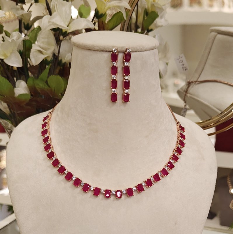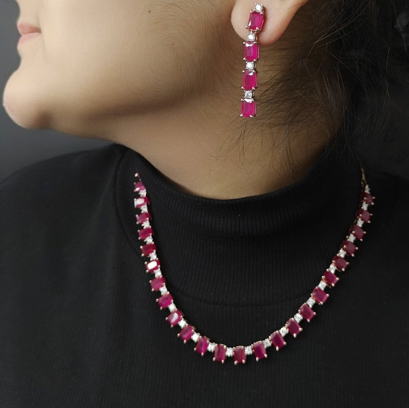 A stunning set featuring an Indo-Western neckline and long dangling earrings crafted with CZ and Ruby Red hydro faceted stones, all coated in Rose Gold plating.