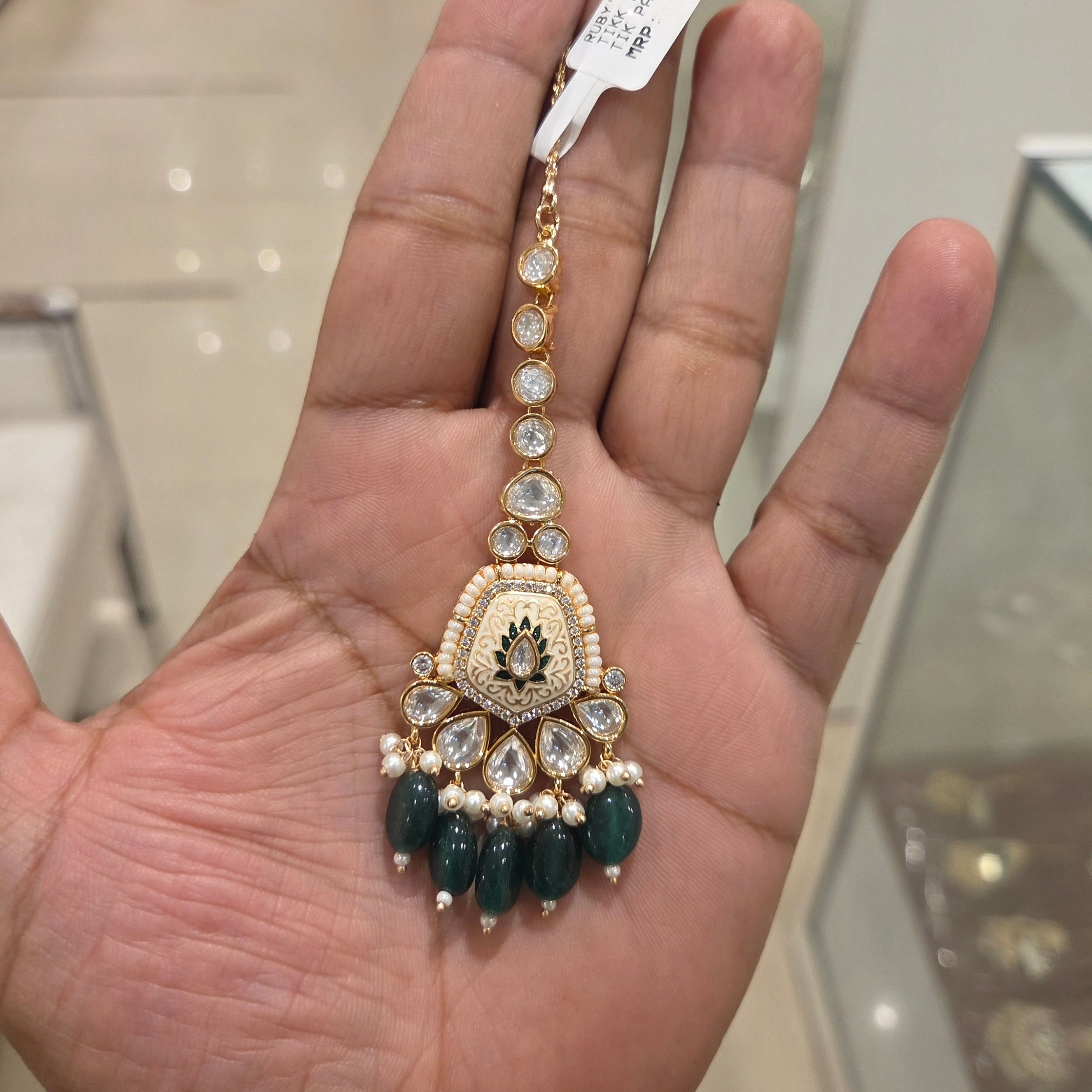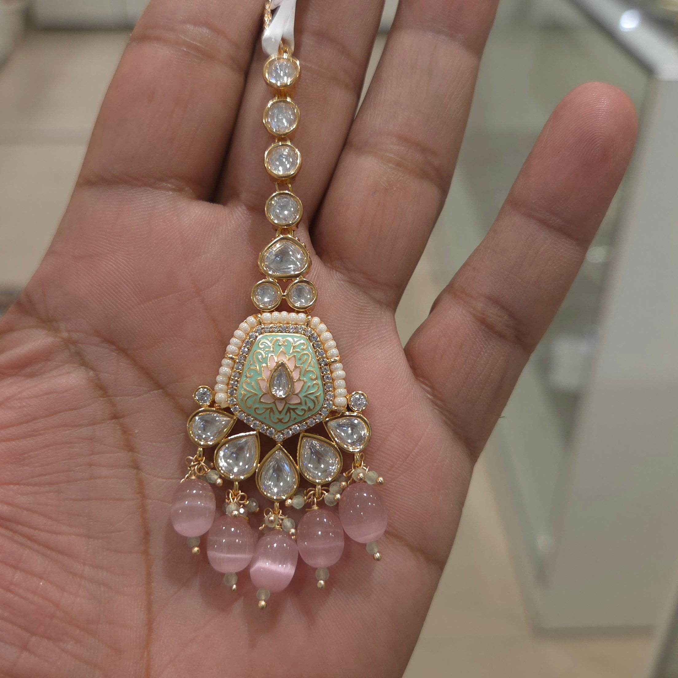 This medium-sized maangtikka, made with high-quality cz uncut polki and plated with 18 kt gold, is a beautiful addition to any outfit. The beading of emerald green and baby pink beads adds a touch of color and elegance. Elevate your look with this stunning and expertly crafted Aaruni polki maangtikka.