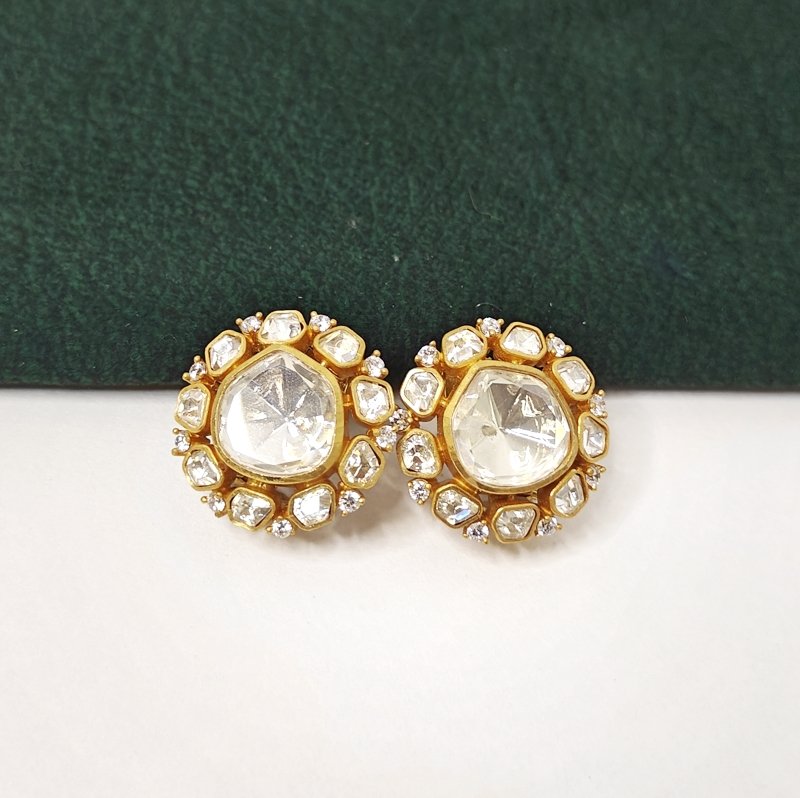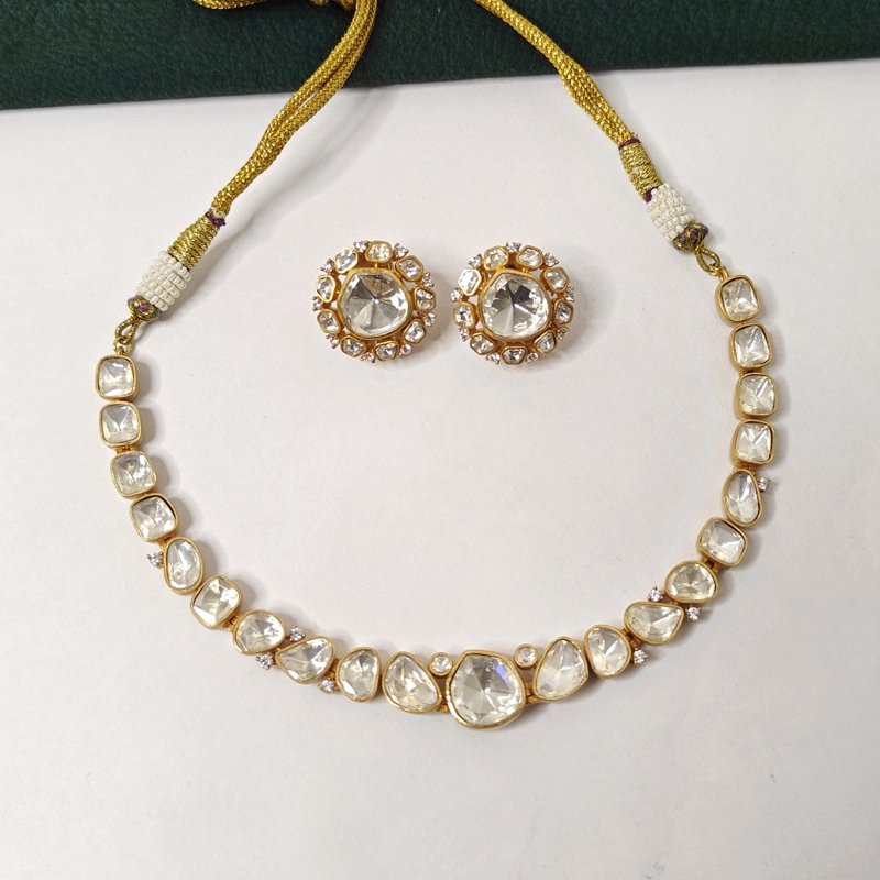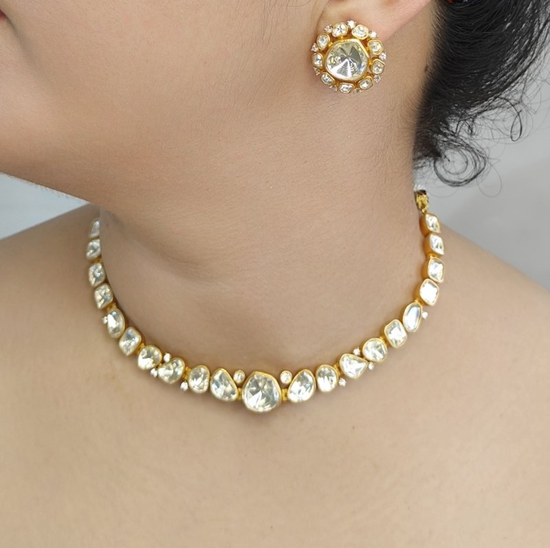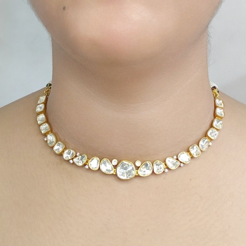 This stunning single line necklace set is a true masterpiece, featuring Moissanite polki and creative ruby gemstones. The design is complemented by intricate silver daak elements and plated with luxurious 22K gold, offering a captivating and elegant finish. Perfect for those seeking a blend of sophistication and timeless beauty.