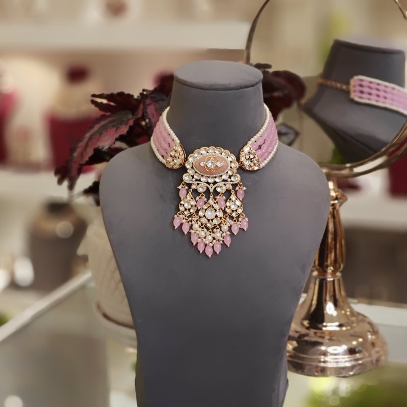 This exquisite jewelry set features magnificent polki and cz stones and hand-carved Pink stone, adorned with lustrous pearls, and complemented drop shaped pink beads. The set is complete with stunning long dangler earrings.