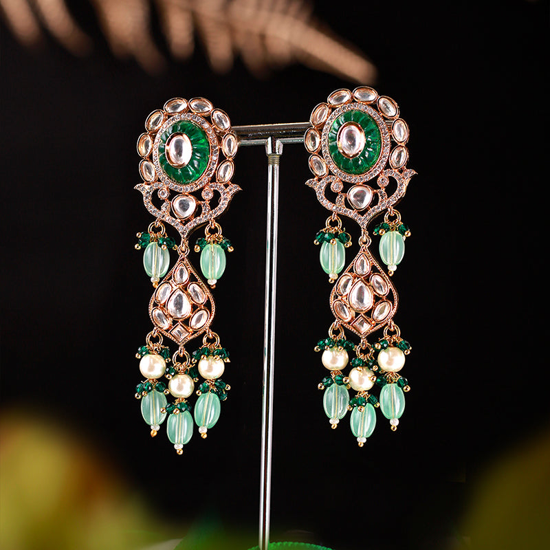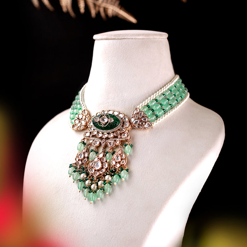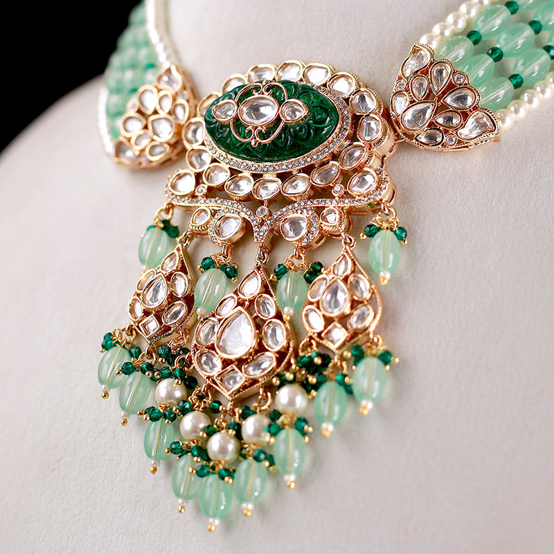 This exquisite jewelry set features magnificent polki and cz stones and hand-carved emerald green stones, adorned with lustrous pearls, and complemented by dark green and mint green beads. The set is complete with stunning long dangler earrings.