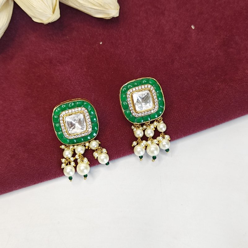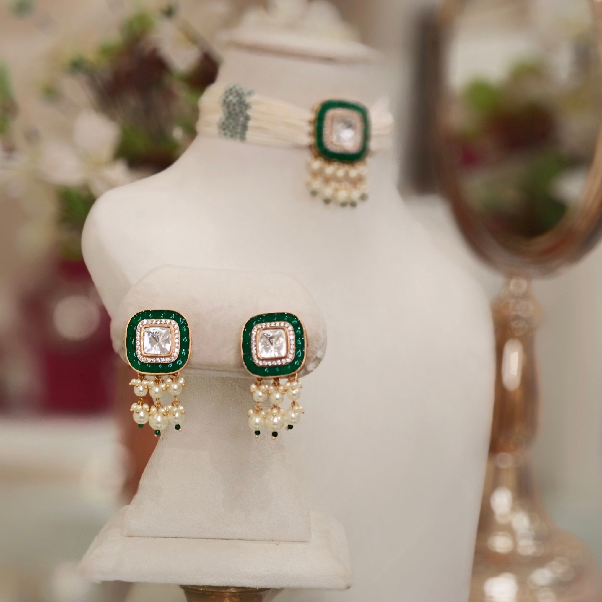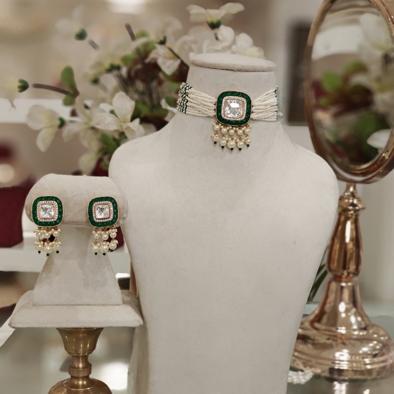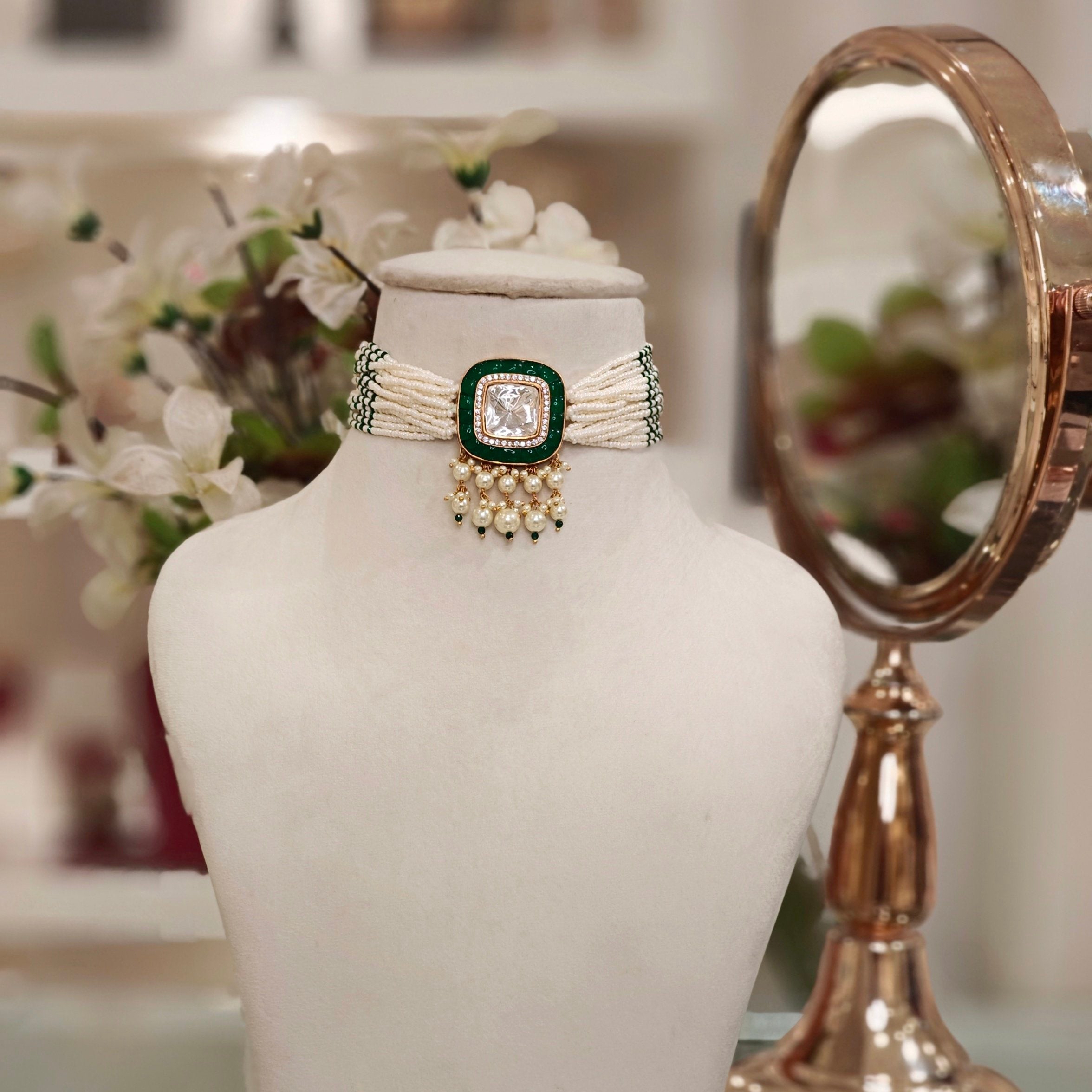 This beautiful choker set is crafted in silver mixed metal alloy and studded with lab grown uncut polkies with pota green stones on sides in invisible setting, paired with stunning studs .This necklace is beaded with pearls at the bottom and strung in micro cheed beads .