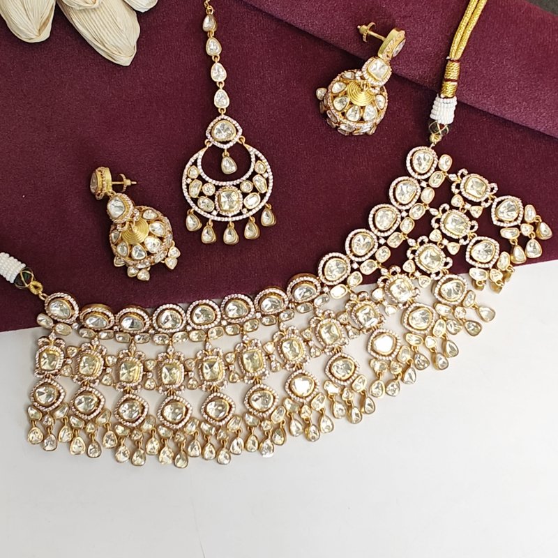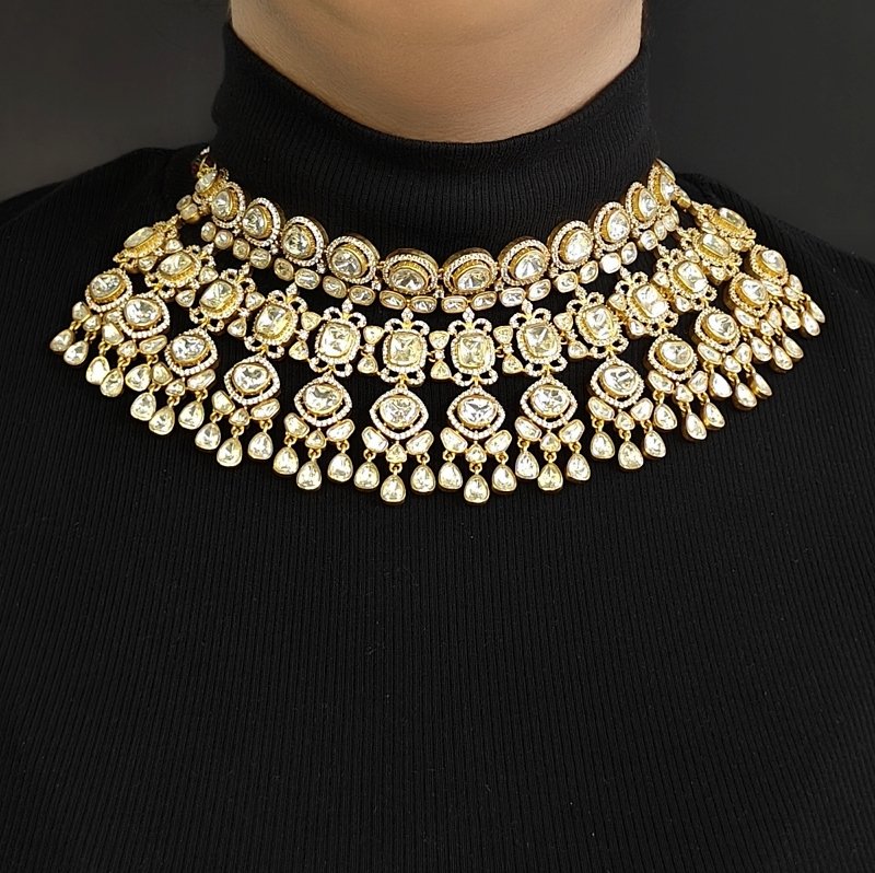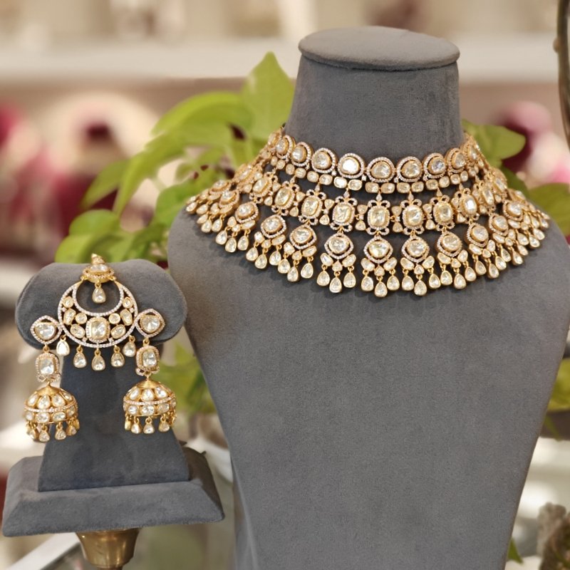 This exquisite bridal necklace set is a true masterpiece, designed with Moissanite polki stones for a timeless sparkle. The set features intricately crafted silver daak elements, elegantly plated in 22K gold for a luxurious and captivating finish. A perfect choice for brides seeking elegance and sophistication on their special day.