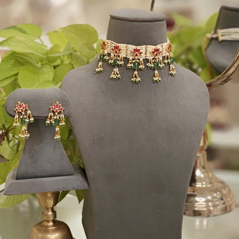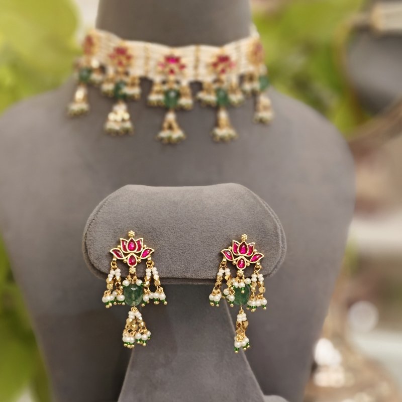 Abeer choker is light weight , elegantly beaded with cheed pearls and hydro emerald green bead with natural inclusions . This necklace is designed in lotus design coloured kundan pieces ,plated in 0.10 micron 22 kt gold .a beautiful elegant statment choker in all