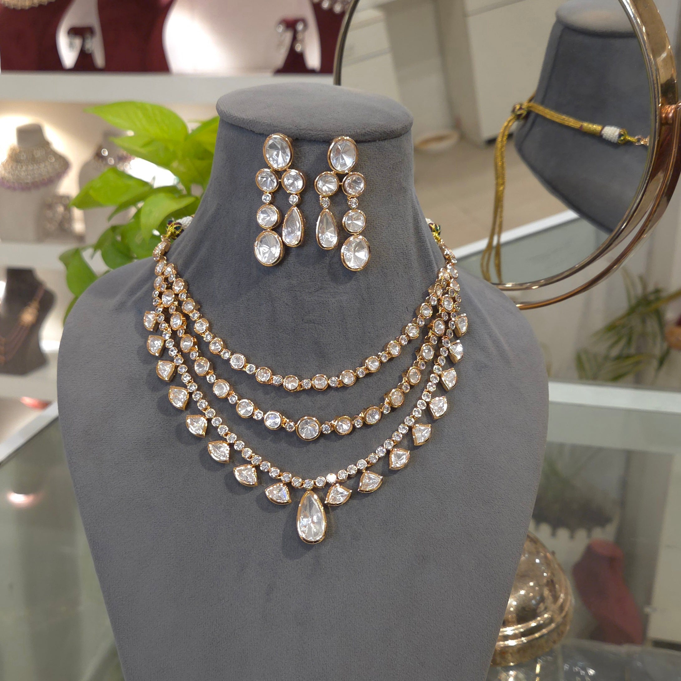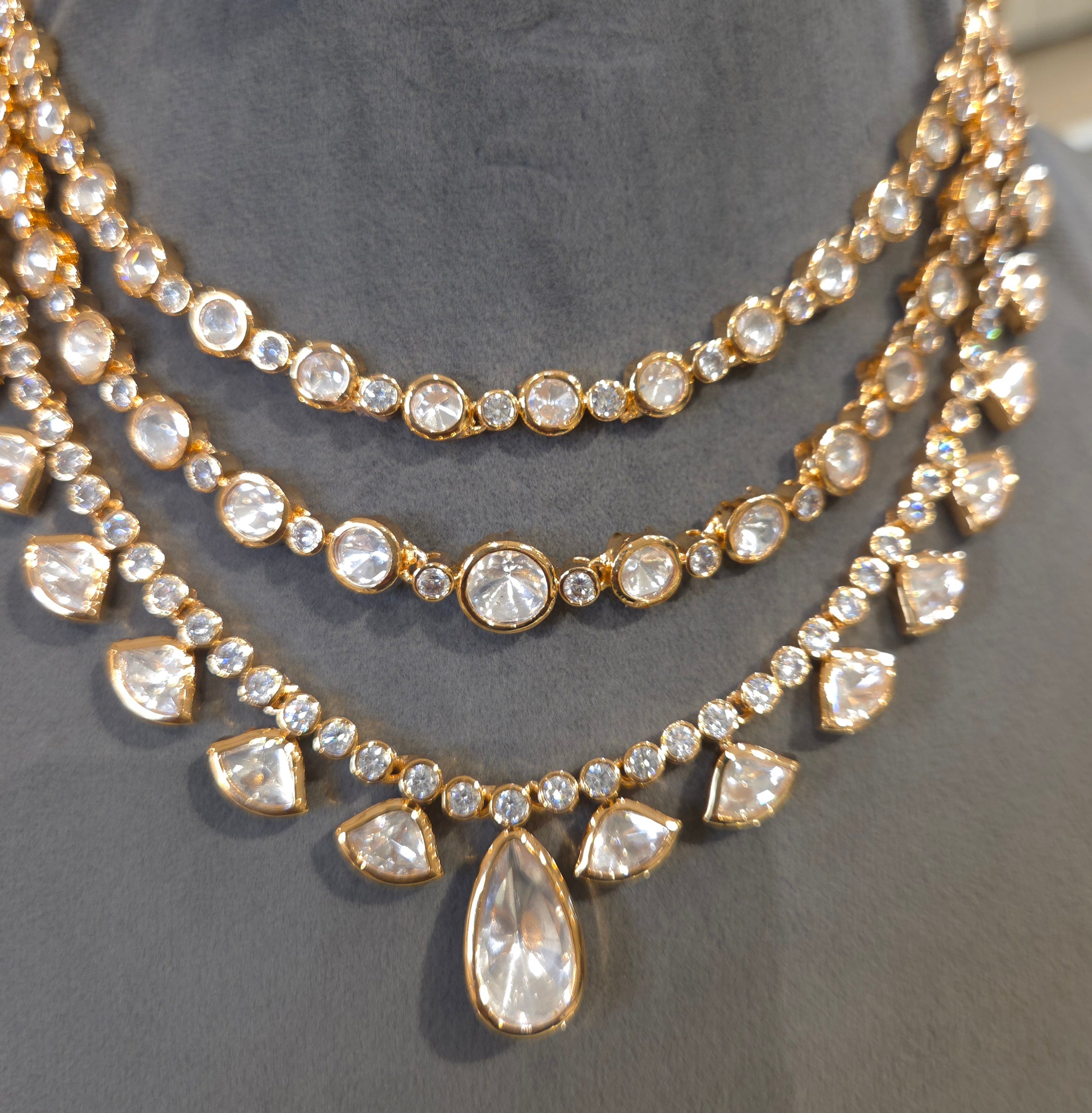 This beautiful, lightweight polki set is a true work of art. It is meticulously crafted from uncut CZ silver foil polki, adding a unique sparkle. The set is expertly fashioned in a mixed metal alloy, ensuring its durability and elegance. Finished with a lustrous 18 kt gold plating, it radiates a sophisticated charm. This exquisite piece is sure to be a treasured addition to any jewelry collection.