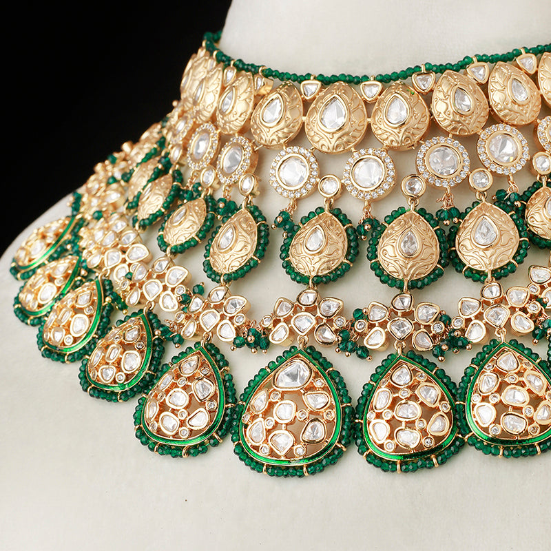A striking necklace intended for a bride, crafted using intricate green meena work and artificial uncut polki stones. The stunning piece is complemented by intricate 22kt gold-plated jhumkas beaded with green hydro beads .