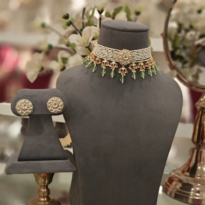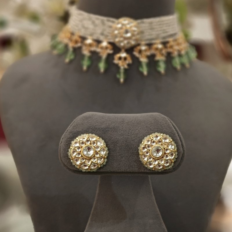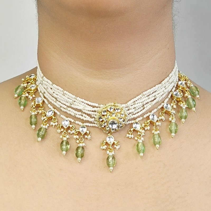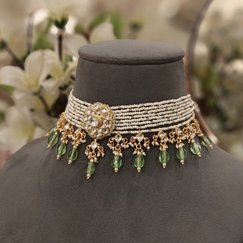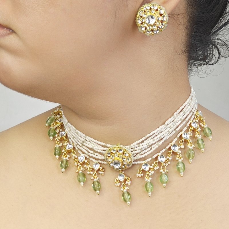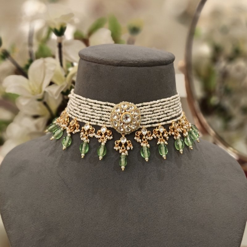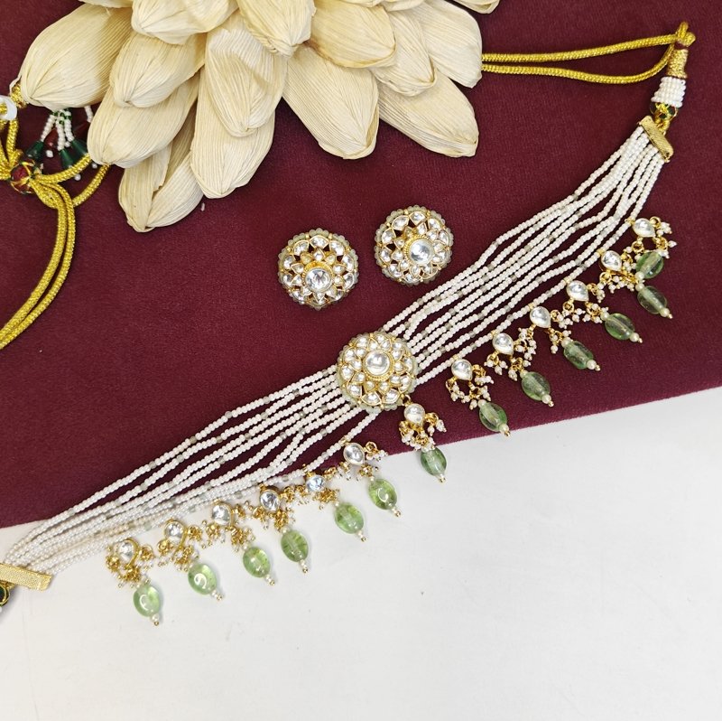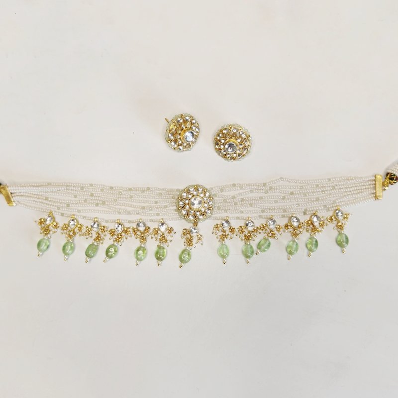 Abhaa choker is light weight and crafted in paachi kundan workmanship ,plated in 22 kt gold .this choker comes with a pair of studs and beaded in micro pearls.
