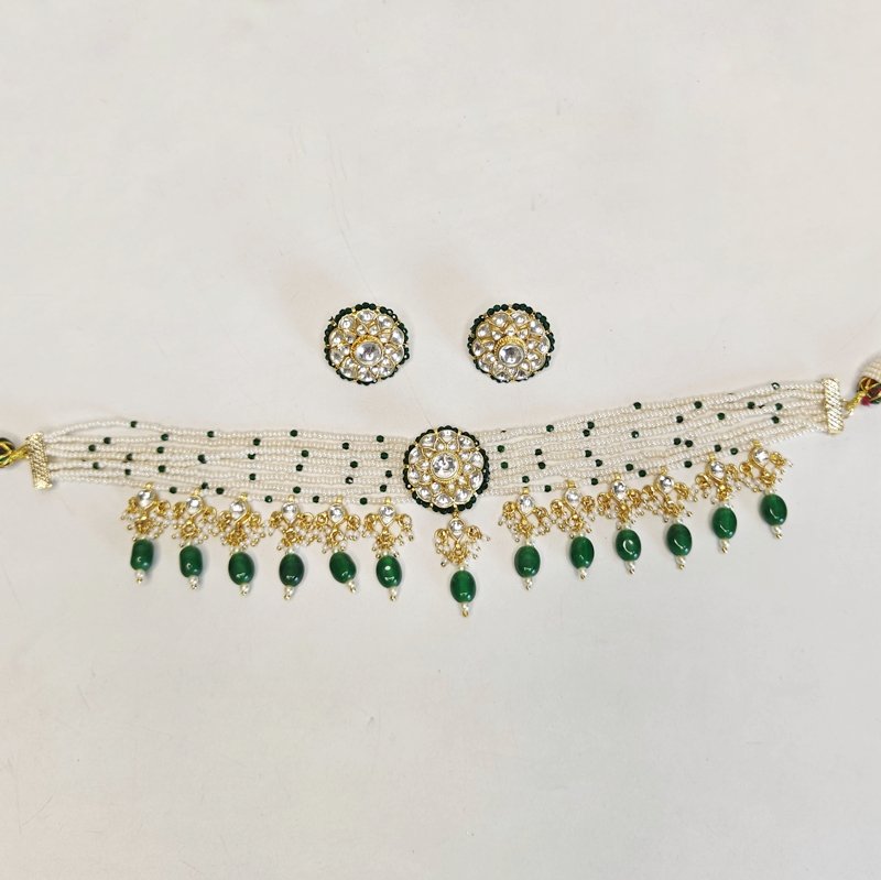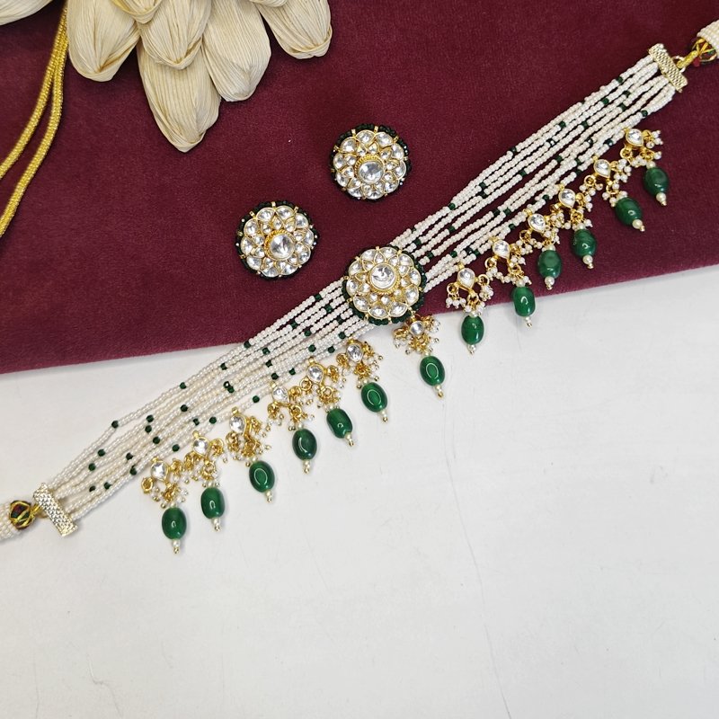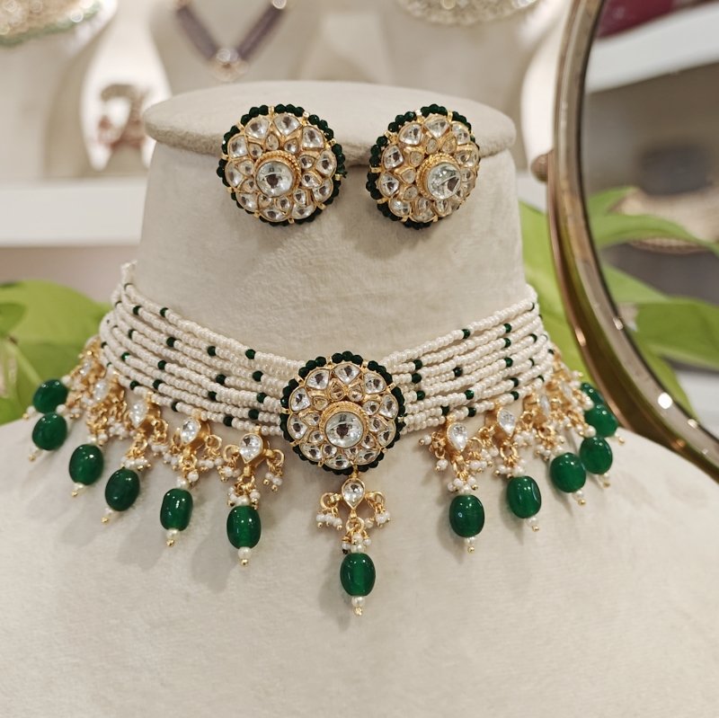Abhaa choker is light weight and crafted in paachi kundan workmanship ,plated in 22 kt gold .this choker comes with a pair of studs and beaded in emerald green beads .