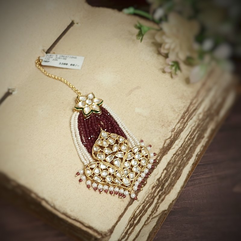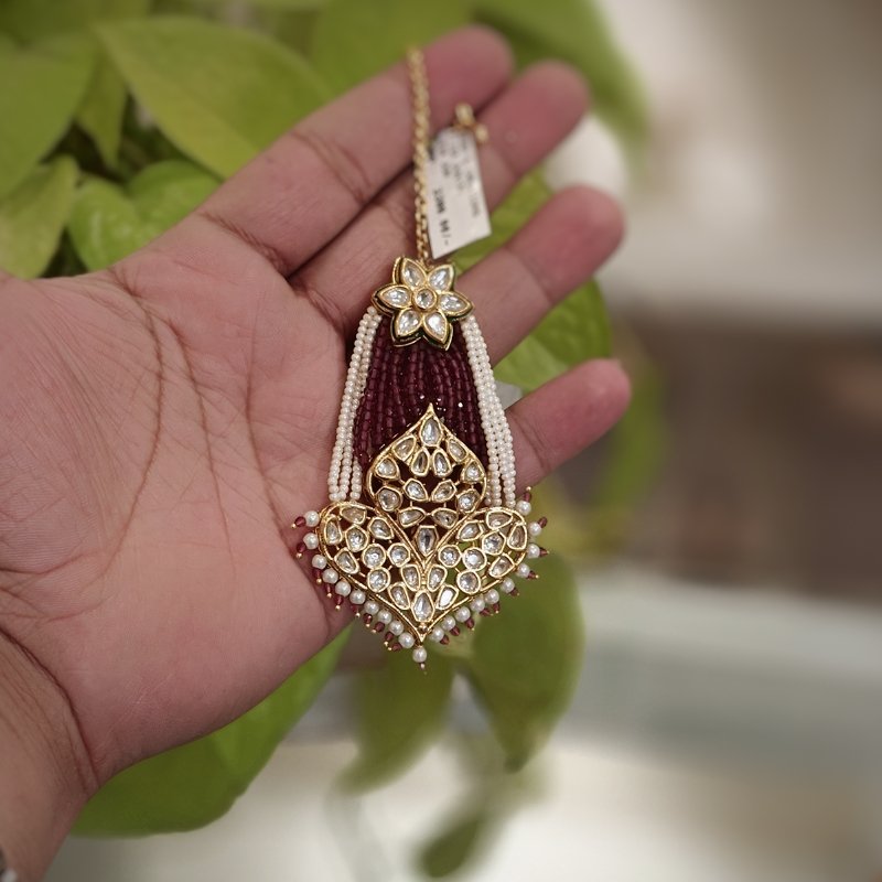 This magnificent maangtikka is crafted using uncut artificial polki stones and pearls beaded with maroon stones . It boasts an 18kt gold plated finish, adding to its exquisite beauty.