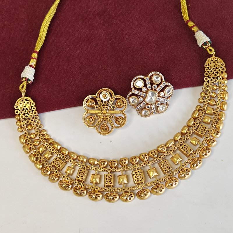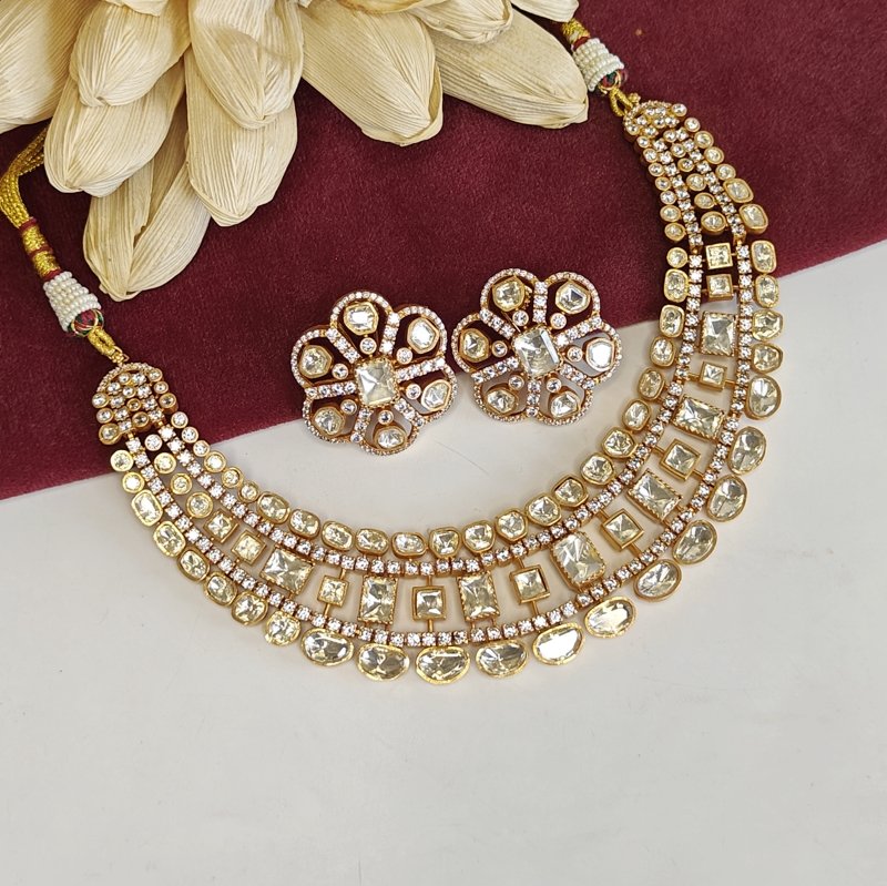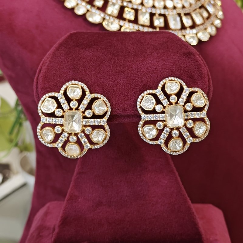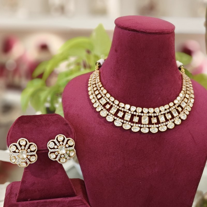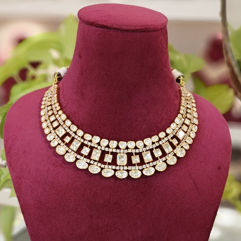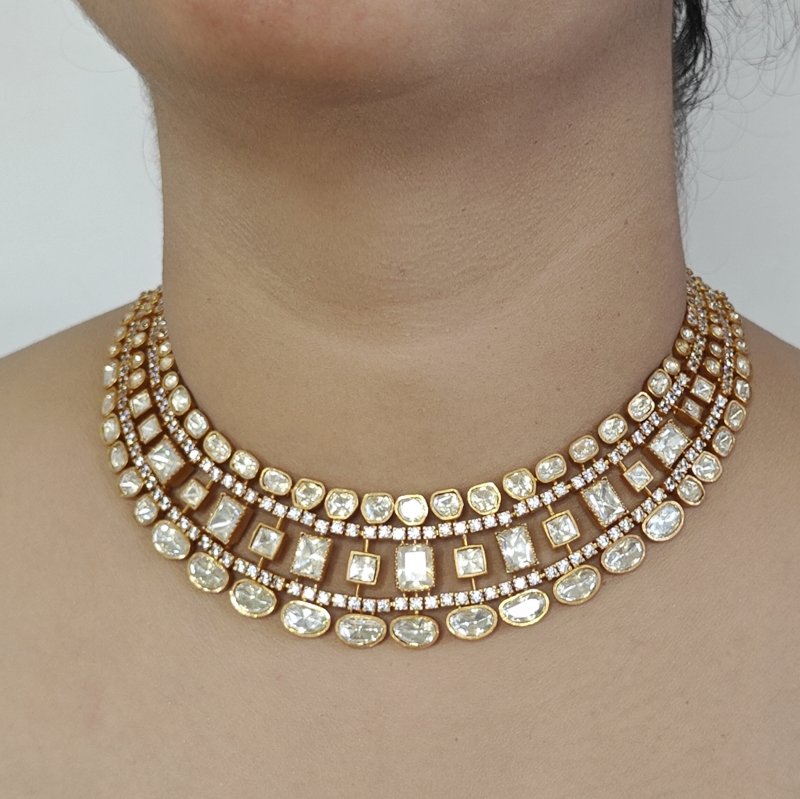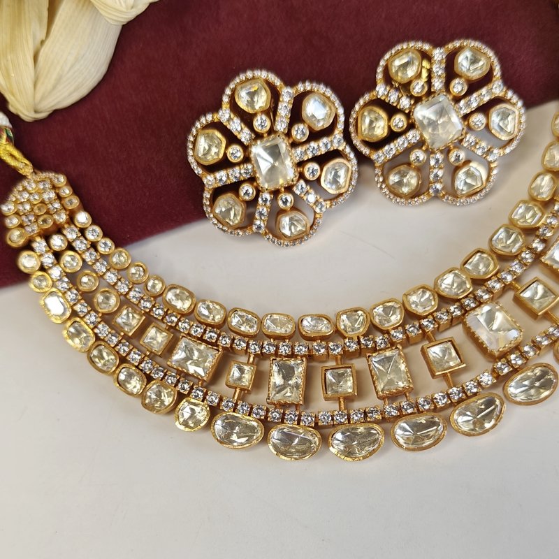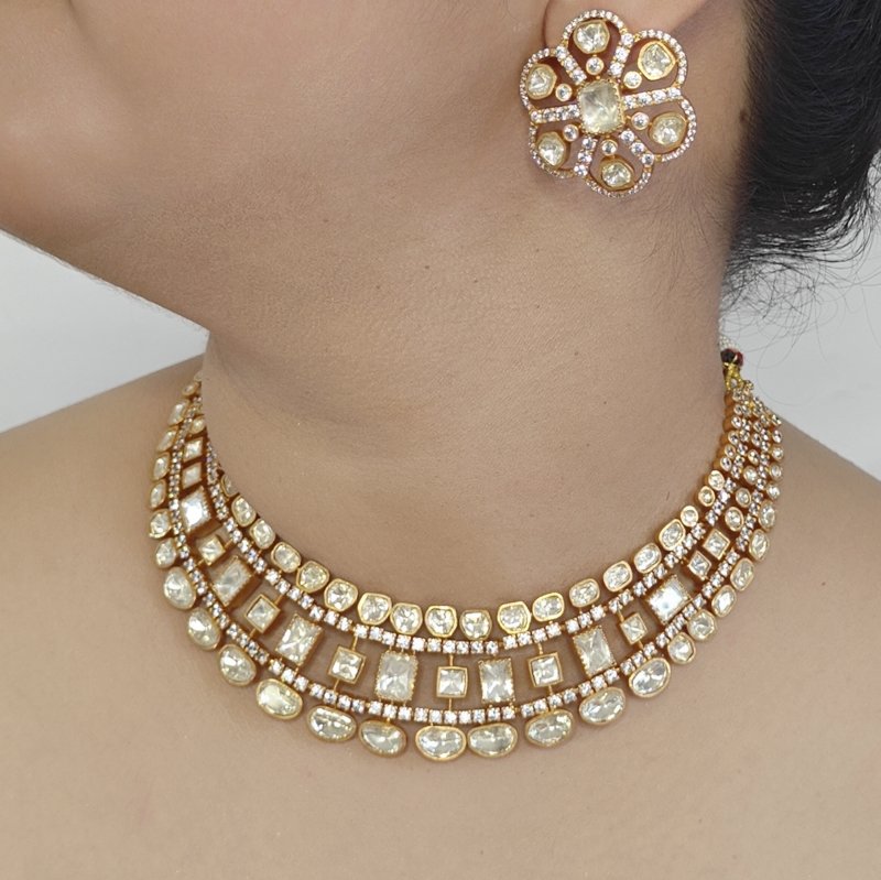 This exquisite bridal necklace set is a true masterpiece, designed with Moissanite polki stones for a timeless sparkle. The set features intricately crafted silver daak elements, elegantly plated in 22K gold for a luxurious and captivating finish. A perfect choice for brides seeking elegance and sophistication on their special day.