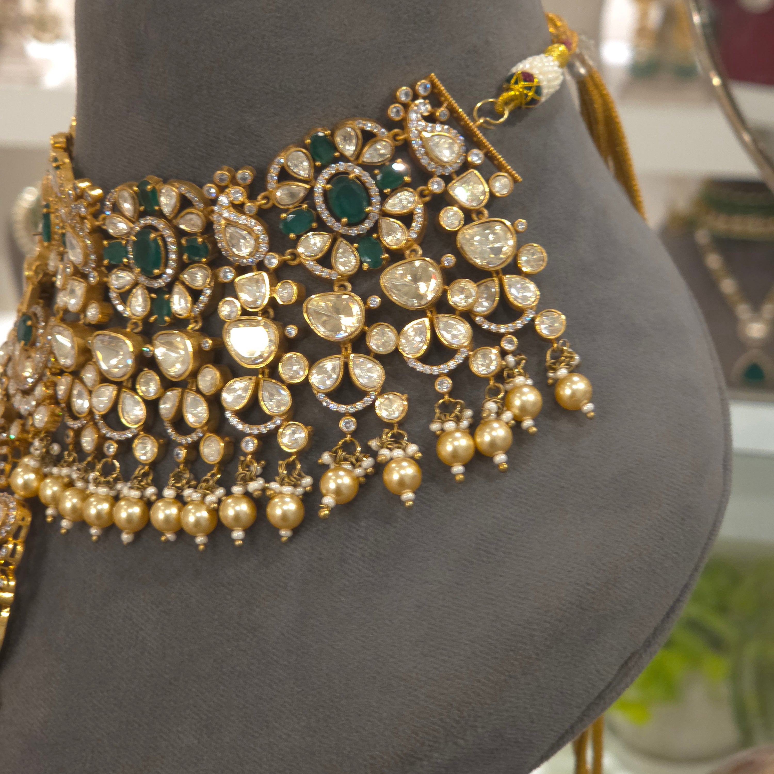 The Agam set is an exquisite bridal necklace. It features lustrous moissanite polki stones, beautifully complemented by vibrant emeralds and ruby red doublets. The necklace is elegantly beaded with off-white pearls, adding a touch of refined grace. This meticulously crafted piece is crafted in mixed metal alloy and plated in 22 kt gold .