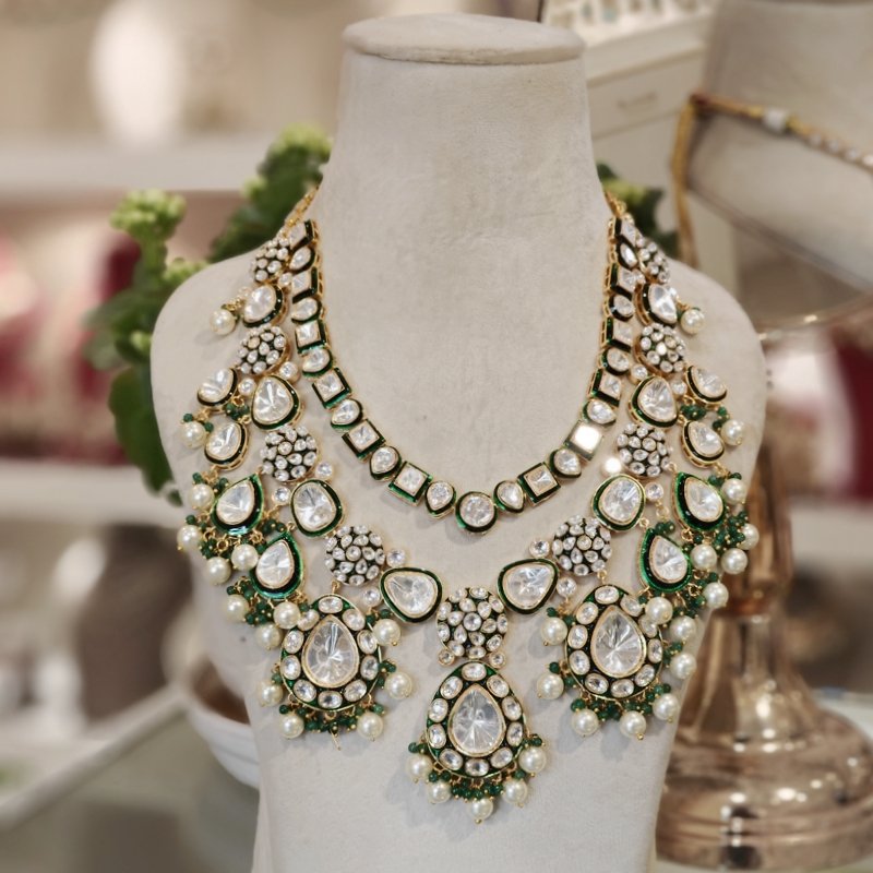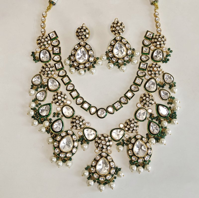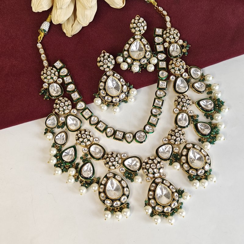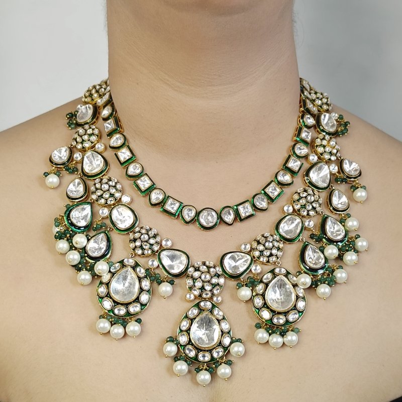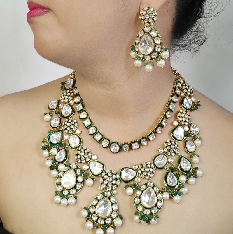 A gorgeous double-line bridal necklace set featuring Kundan Polki stones with green meenakari work around it , intricately beaded with pearls and emerald green stones. Plated in 22kt gold and crafted from a silver mixed metal alloy, this set beautifully combines traditional elegance with modern design.