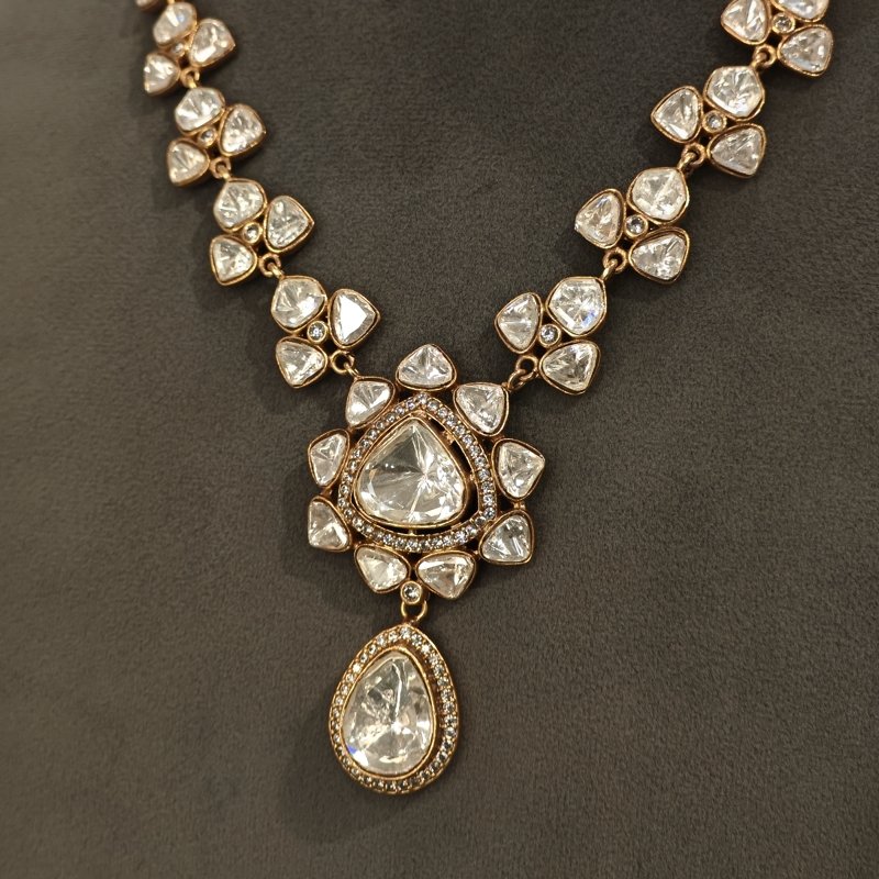 This pendant and earrings set features lab-created uncut polki stones, surrounded by sparkling CZ stones and plated in 22kt gold. The design beautifully combines classic elegance with modern craftsmanship for a luxurious look.