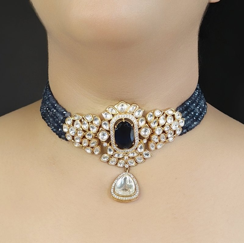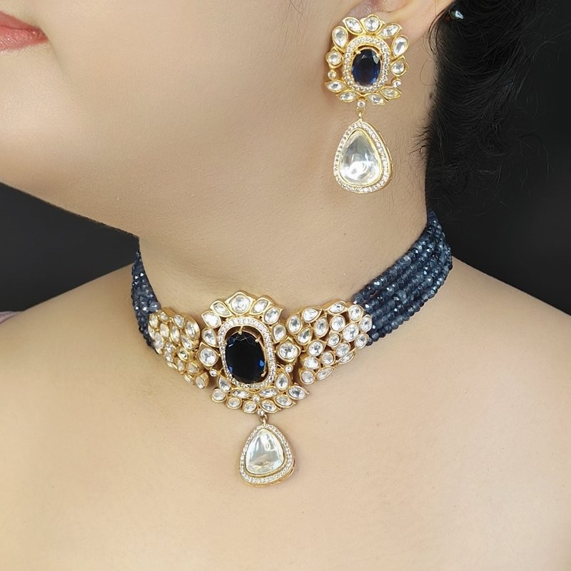 This striking choker set boasts a center blue stone with side polki extensions, complemented by elegantly dangling earrings adorned withroyal blue stones .
