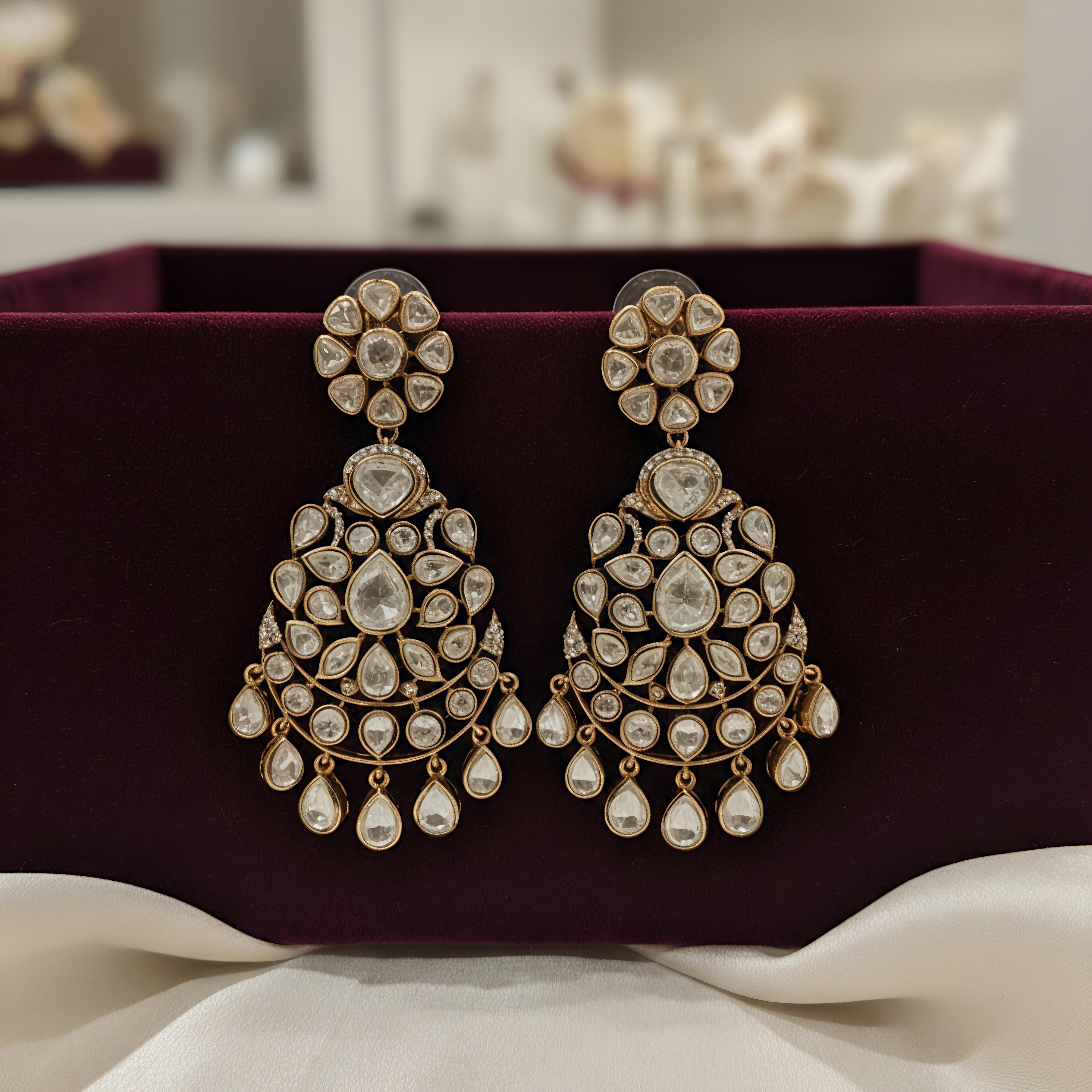 Exquisite chaandbali earrings crafted with moissanite polki and CZ stones, finished in 22kt gold plating for a stunning look.