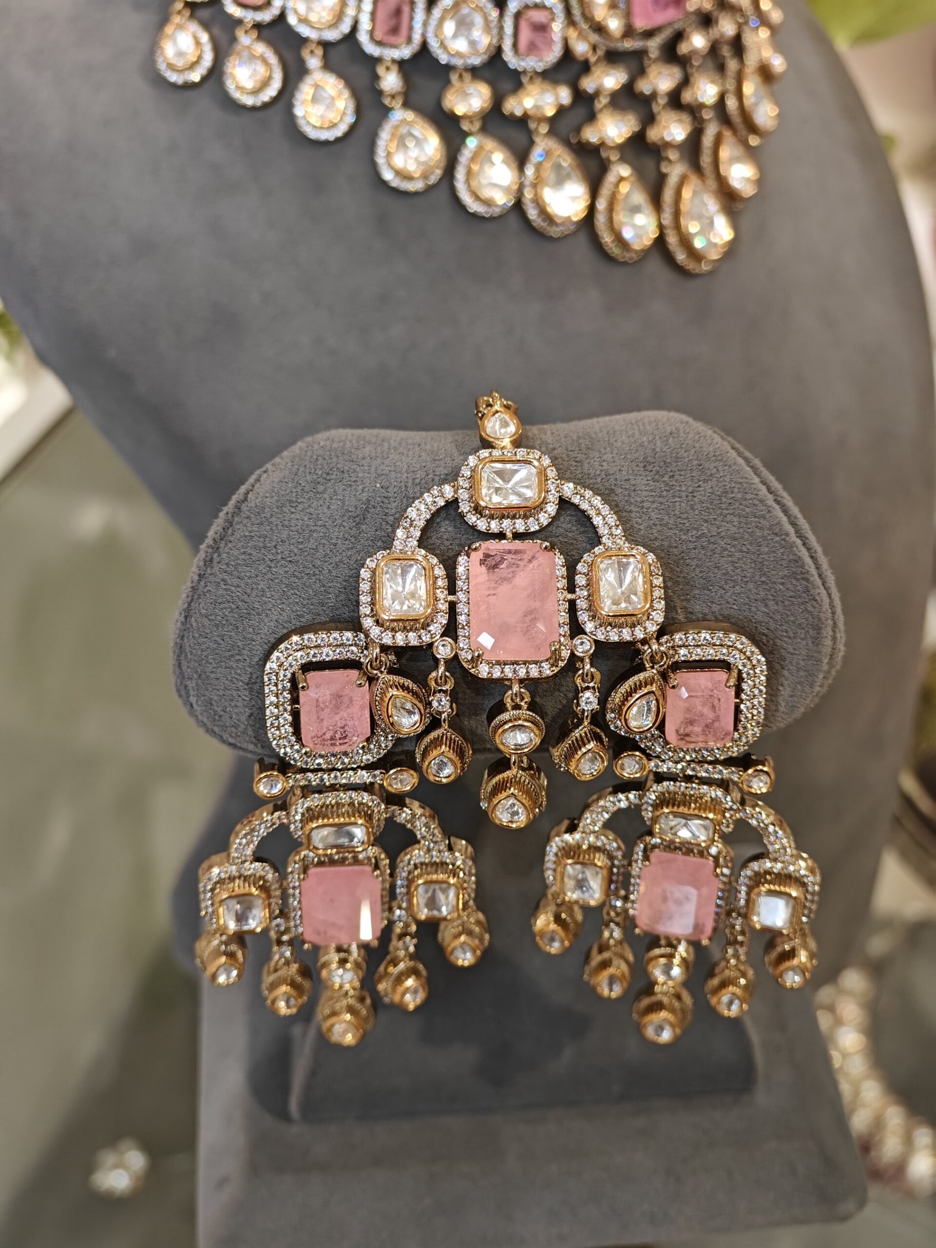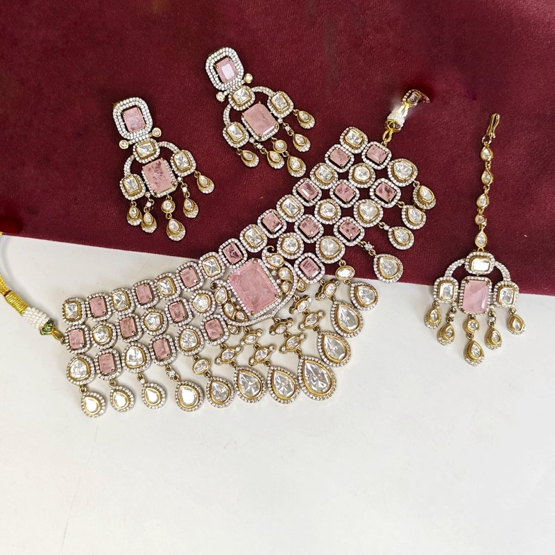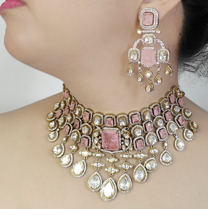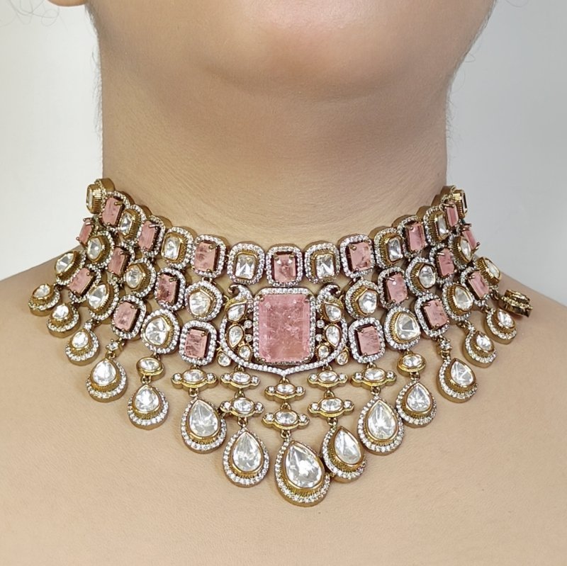 This elegant choker, crafted in a mehndi polish finish, features pink hydro stones with natural inclusions, creating an authentic emerald-like appearance. Adorned with uncut polki gems, it combines traditional charm with a modern touch, making it a comfortable and stylish accessory for any special occasion.