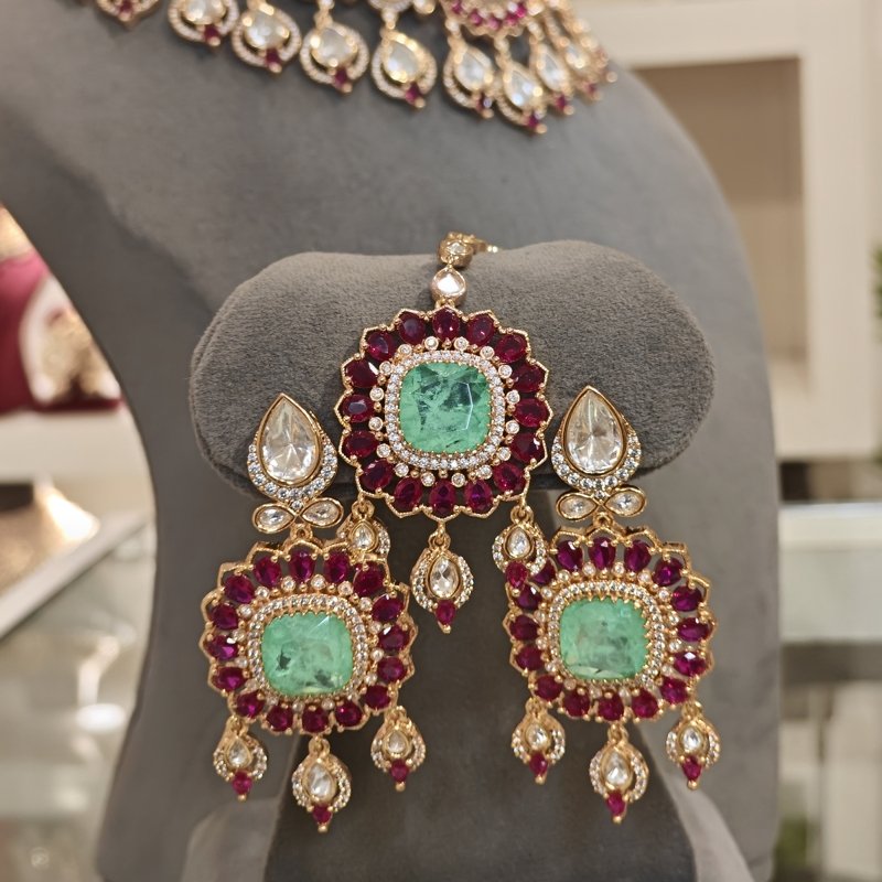 This elegant choker, crafted in a mehndi polish finish, features mint green hydro stones with natural inclusions, creating an authentic emerald-like appearance. Adorned with uncut polki gems, it combines traditional charm with a modern touch, making it a comfortable and stylish accessory for any special occasion.