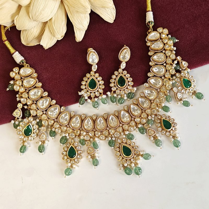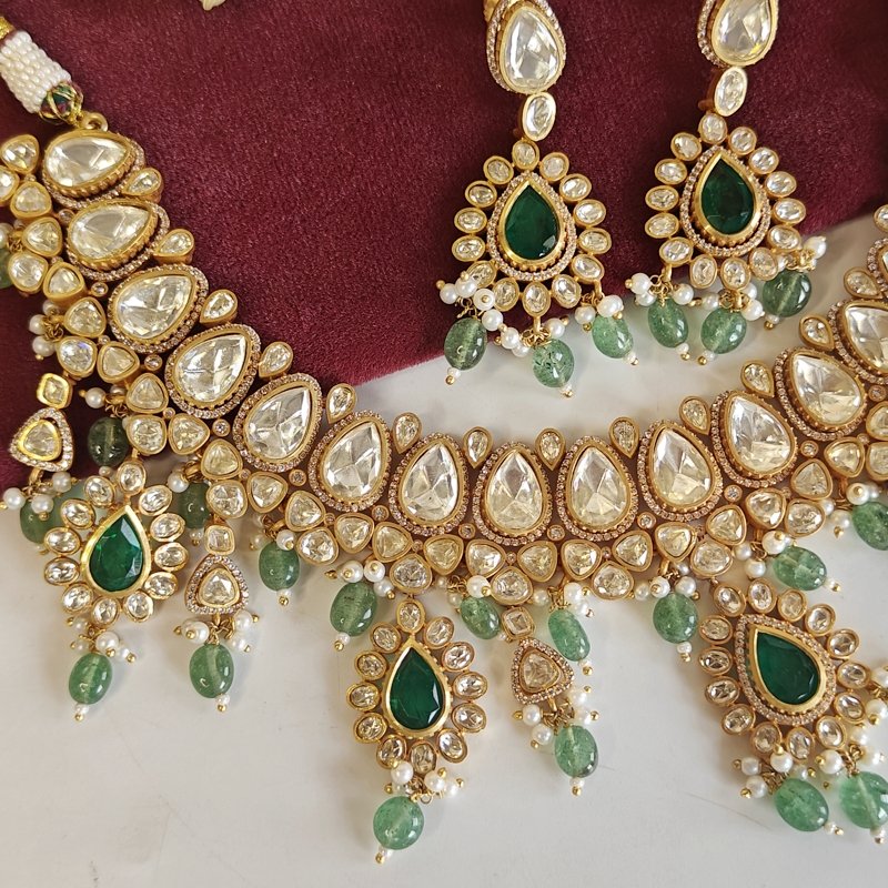 This exquisite bridal necklace set is a true masterpiece, designed with Moissanite polki stones for a timeless sparkle. The set features intricately crafted silver daak elements beaded with real mint green coloured strawberry beads , elegantly plated in 22K gold for a luxurious and captivating finish. A perfect choice for brides seeking elegance and sophistication on their special day.