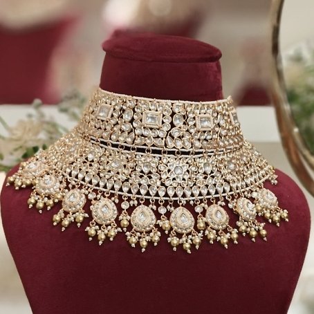 The Alia choker set is meticulously crafted using the finest uncut artificial polkies, which is then plated with a luxurious 22kt gold hue to add more charm to it. To create this ornate piece of beauty even more special, the necklace is integrated with lovely pearls and gold plated balls that are arranged in a beaded fashion. This necklace can be customized in any colour of your choice .