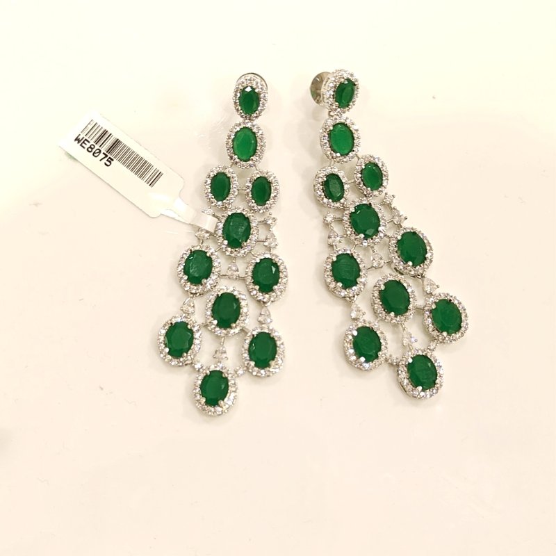 The stunning earrings consist of high-quality CZ and emerald green faceted stones. They possess a three line design and are coated in white rhodium plating.