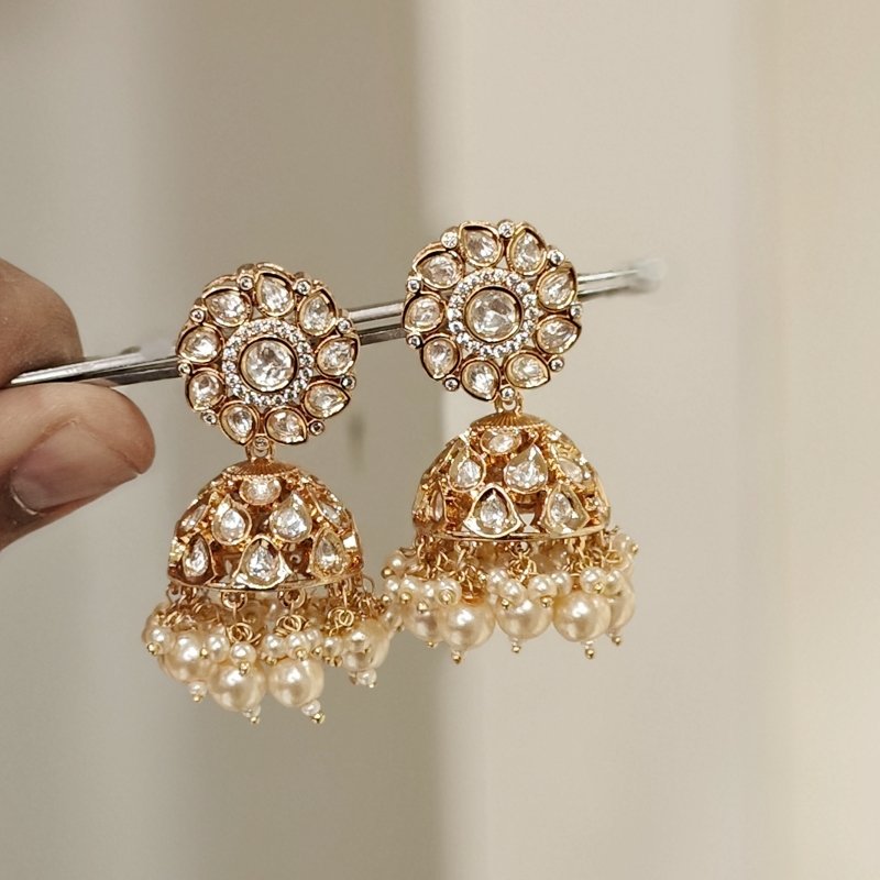 Anushka jhumkas are made in finest quality uncut CZ polki which is real replica of diamond polki stones .Metal used is silver mixed metal alloy and plated in 22 kt gold ,beaded in off white pearls ,can be customised to any colour of your choice ( subject to availability).