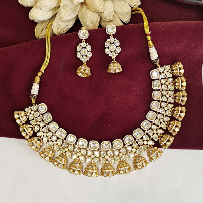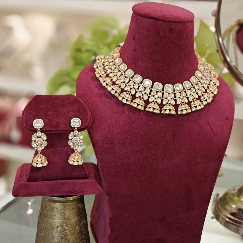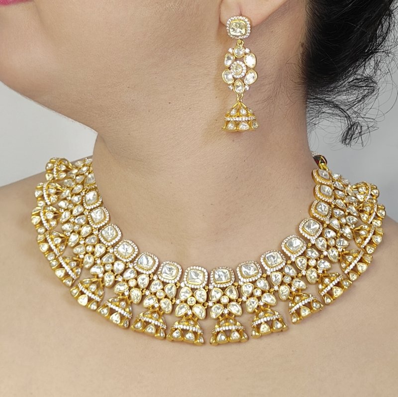 This exquisite bridal necklace set is a true masterpiece, designed with Moissanite polki stones for a timeless sparkle. The set features intricately crafted silver daak elements, elegantly plated in 22K gold for a luxurious and captivating finish. A perfect choice for brides seeking elegance and sophistication on their special day.