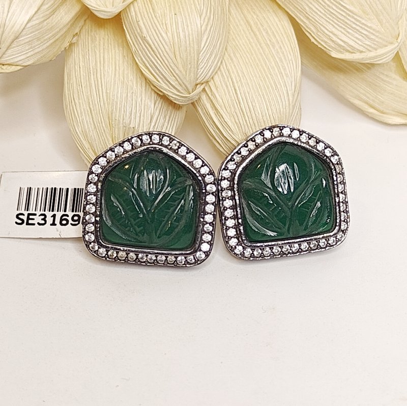 These medium sized studs are made with hand carved green stones, surrounded by cz stones and plated in black rhodium polish .