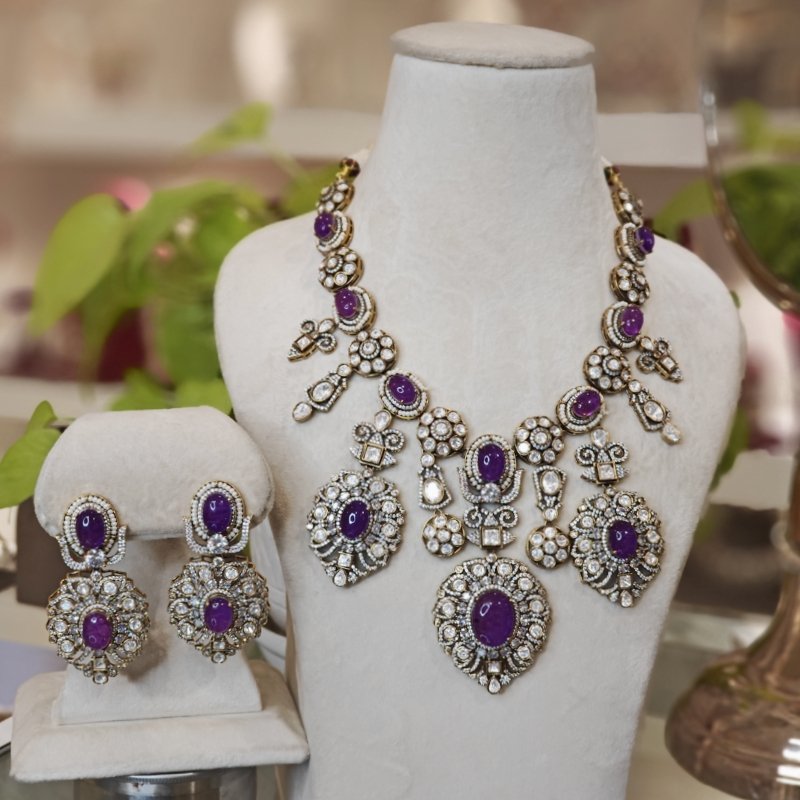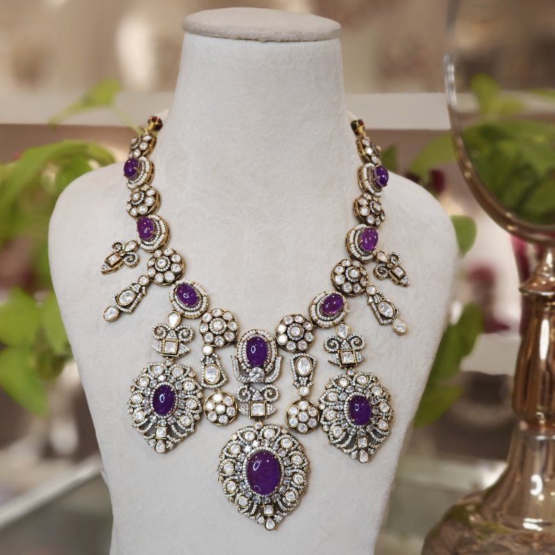 A beautiful long set crafted with luxurious purple-shaded doublet stones, surrounded by moissanite and CZ stones, plated in 14kt gold with an antique polish.