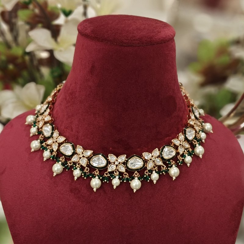 This elegant neckline set is made in silver mixed metal alloy and studded with kundan polki stones with green micro beads paired with off white pearls , can be customised in any colour of your choice .