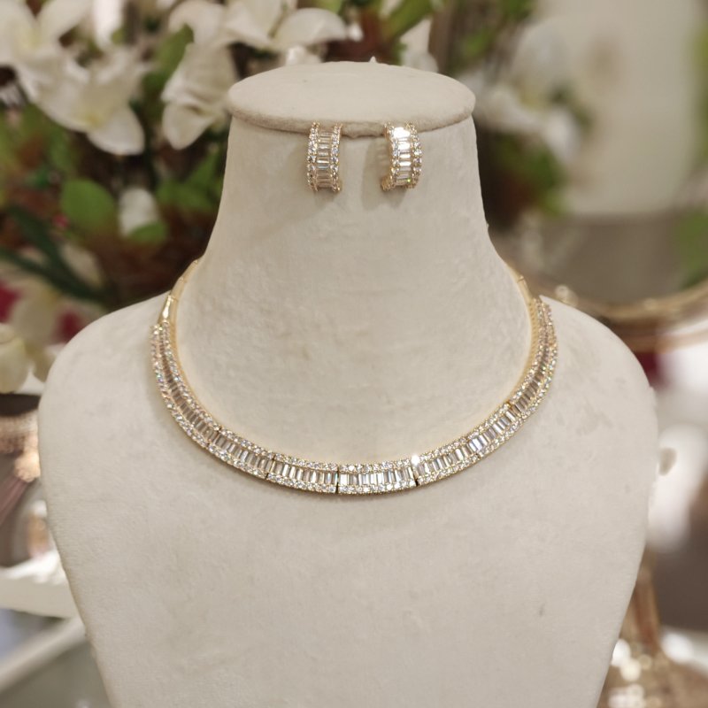 Beautiful necklane set in bagguets and round cz stoes with half bali plated in yellow gold color.
