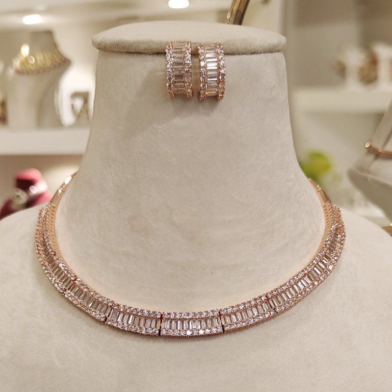 Beautiful Necklane Set In Bagguets And Round Cz Stones Paired With Half Bali Earrings Plated In Rose Gold Color.